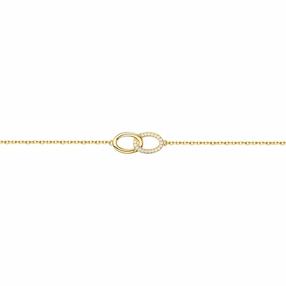 Ce bracelet fantaisie en plaqué or jaune mesure 16cm au plus court et s’adapte jusqu’à 19cm au plus long. Son motif central se compose de deux anneaux entrelacés de forme ovale dont un est serti d’oxyde de zirconium blancs.[/vc_column_text][/vc_column][/vc_row][vc_row][vc_column]