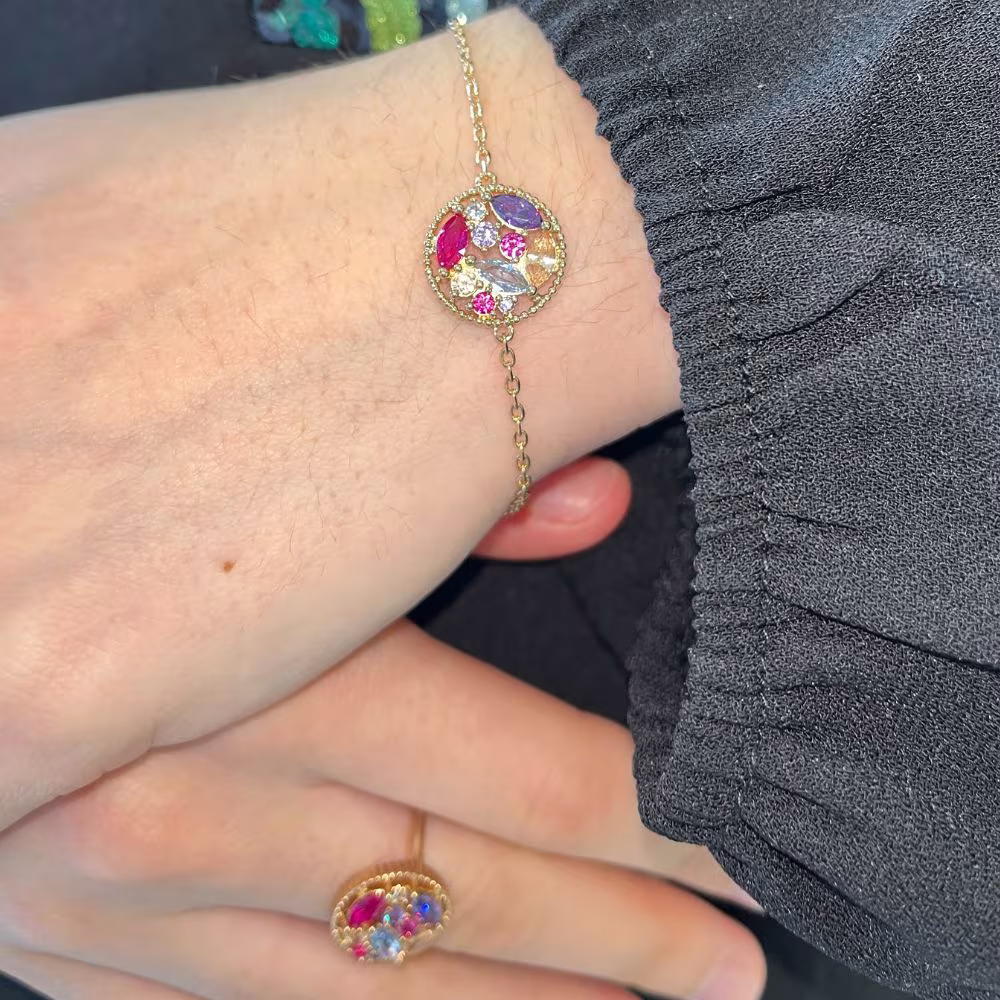 Ce bracelet POP en plaqué or jaune se compose d’une chaine de 16cm (+3cm) et son motif central met en avant un travail en oxyde de zirconium colorés et de tailles variées. Il sont serti dnas un cercle a la finition perlée accentuant sa féminité