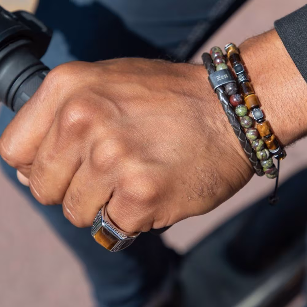 Le bracelet pour homme de la marque Rochet, issu de la collection Karma, est un bijou au design unique et raffiné. Il se compose d’un brin en cuir vert tressé et de perles de jaspe vert, créant un contraste harmonieux entre les textures et les matériaux. Un fermoir aimanté en acier vieilli, accompagné d’un insert central, ajoute une touche d’authenticité et de robustesse à l’ensemble. Ce bracelet incarne l’élégance naturelle et est idéal pour l’homme moderne à la recherche d’un accessoire distinctif et intemporel.