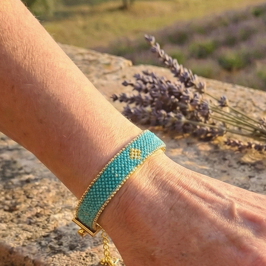 🧵 Un savoir-faire artisanal d’exception Loin des bijoux industriels, chaque bracelet est une création unique. Je tisse les perles Miyuki (des perles de verre japonaises réputées pour leur incroyable régularité) une à une à l’aiguille.