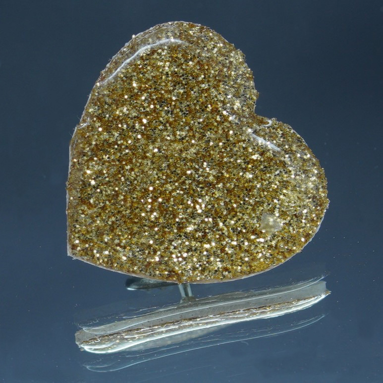 Cette broche en forme de cœur brille de mille feux grâce à son revêtement pailleté aux reflets dorés.