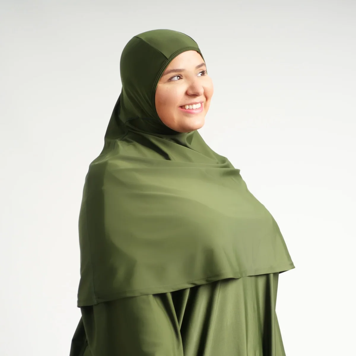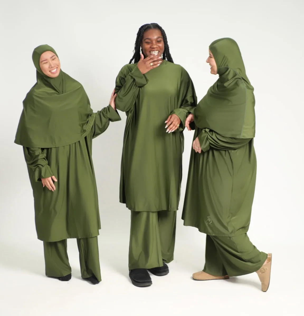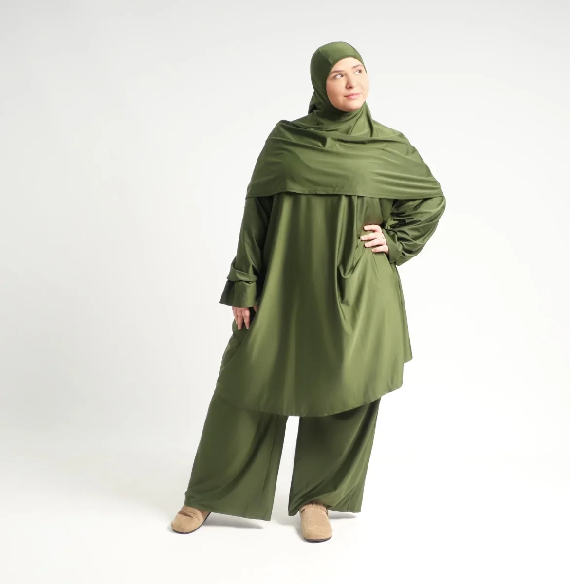 Ensemble de 3 pièces équipés de deux clips de chaque côté du pantalon, assurant une tenue impeccable dans l’eau en évitant les remontées gênantes. Les épaules du hijab sont également sécurisées par deux clips, offrant un maintien optimal. Le hijab est spécialement conçu avec une longueur idéale pour dissimuler élégamment la poitrine.