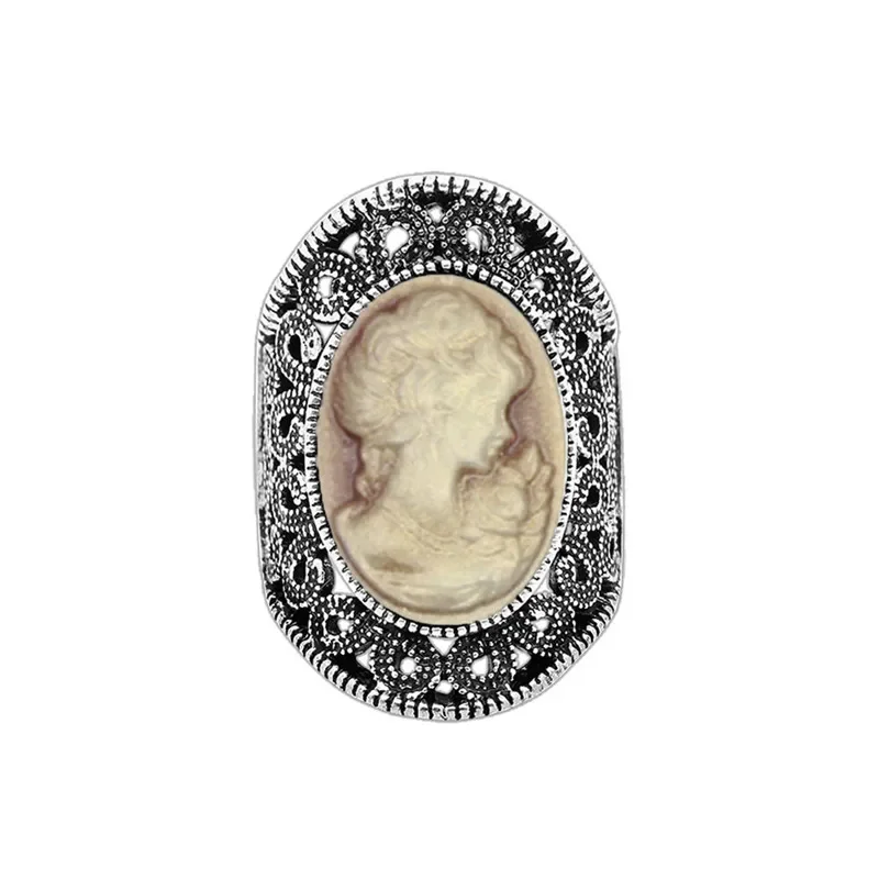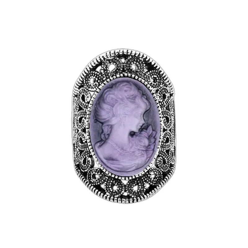 Cette magnifique camée bague se distingue par sa base en alliage de zinc de couleur argentée, sculptée de motifs floraux sur le côté. Au centre, la pierre ovale est un camée en résine, sculpté d’un visage de femme avec un motif floral. Elle est disponible en plusieurs couleurs, ce qui vous permet de choisir celle qui correspond à votre style : bleu, marron, rose et violet.
