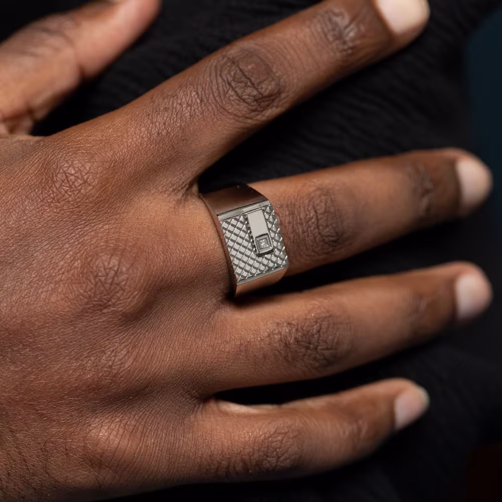 Cette chevaliere en acier argenté 316L de la collection Phebus pour homme est un bijou raffiné et contemporain. La table de cette bague est en finition gaufré et s’accompagne d’un petit brillant pour le coté précieux.[/vc_column_text][/vc_column][/vc_row][vc_row][vc_column]