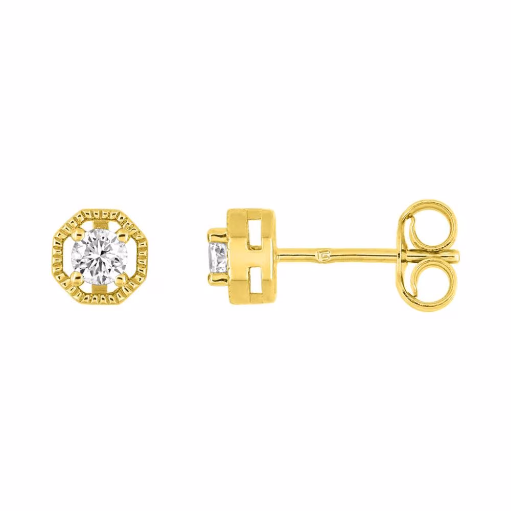 Ces boucles d’oreilles type clou sont farbiquées en or jaune 9 carats (375/1000). Chaque boucle présente un motif octogonal subtil et raffiné, mettant en valeur un oxyde de zirconium central serti 4 griffes, qui capte la lumière avec éclat.