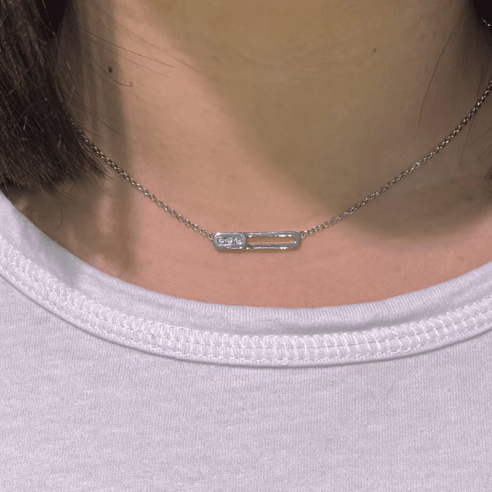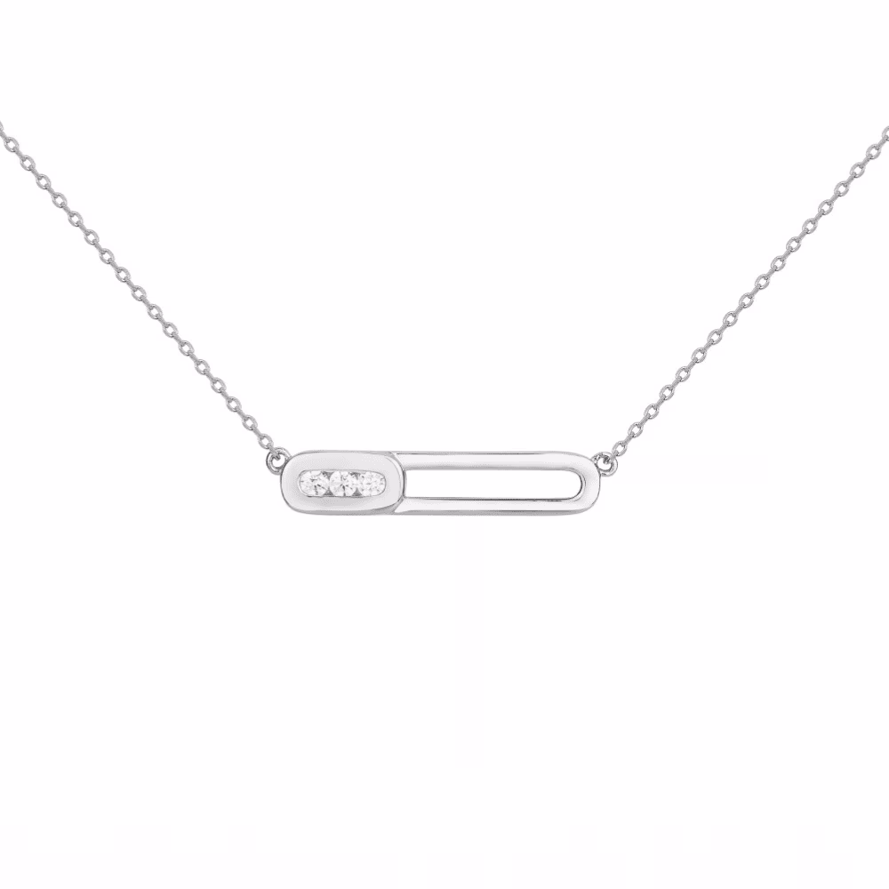 Élégant et intemporel, ce collier en argent rhodié 925/1000 se distingue par un motif central en forme de barrette horizontale ajourée. Finement travaillé, ce motif est sublimé par trois oxydes de zirconium blancs sertis avec précision, apportant éclat et raffinement à l’ensemble.