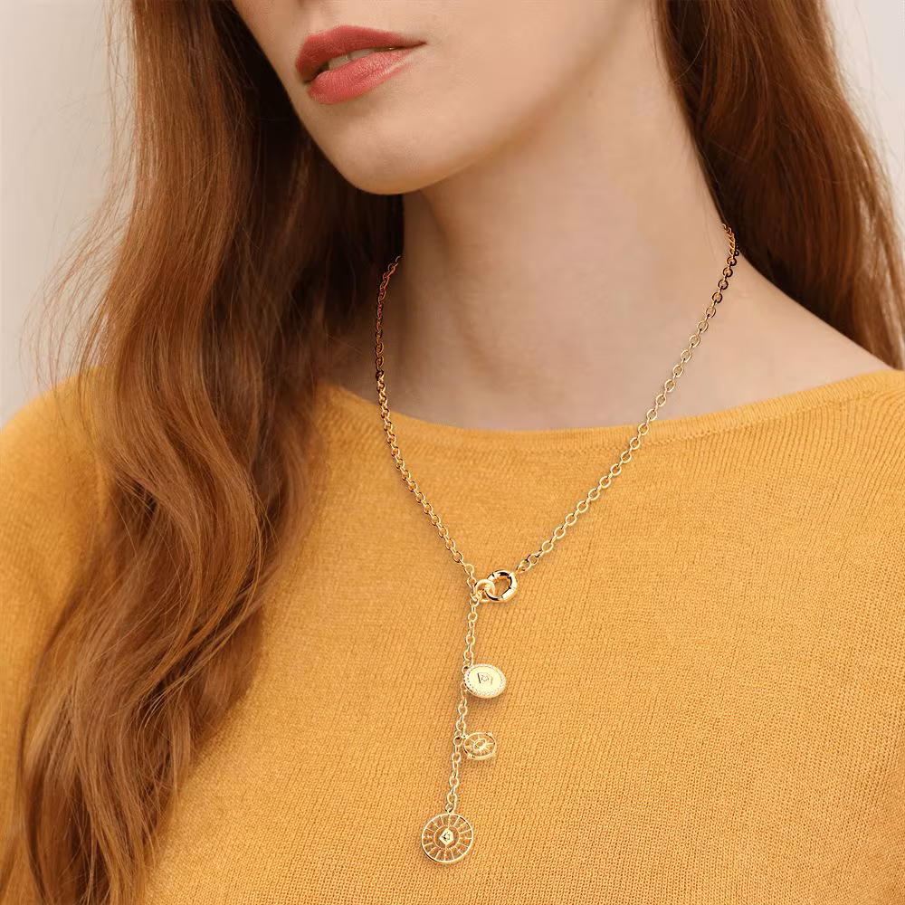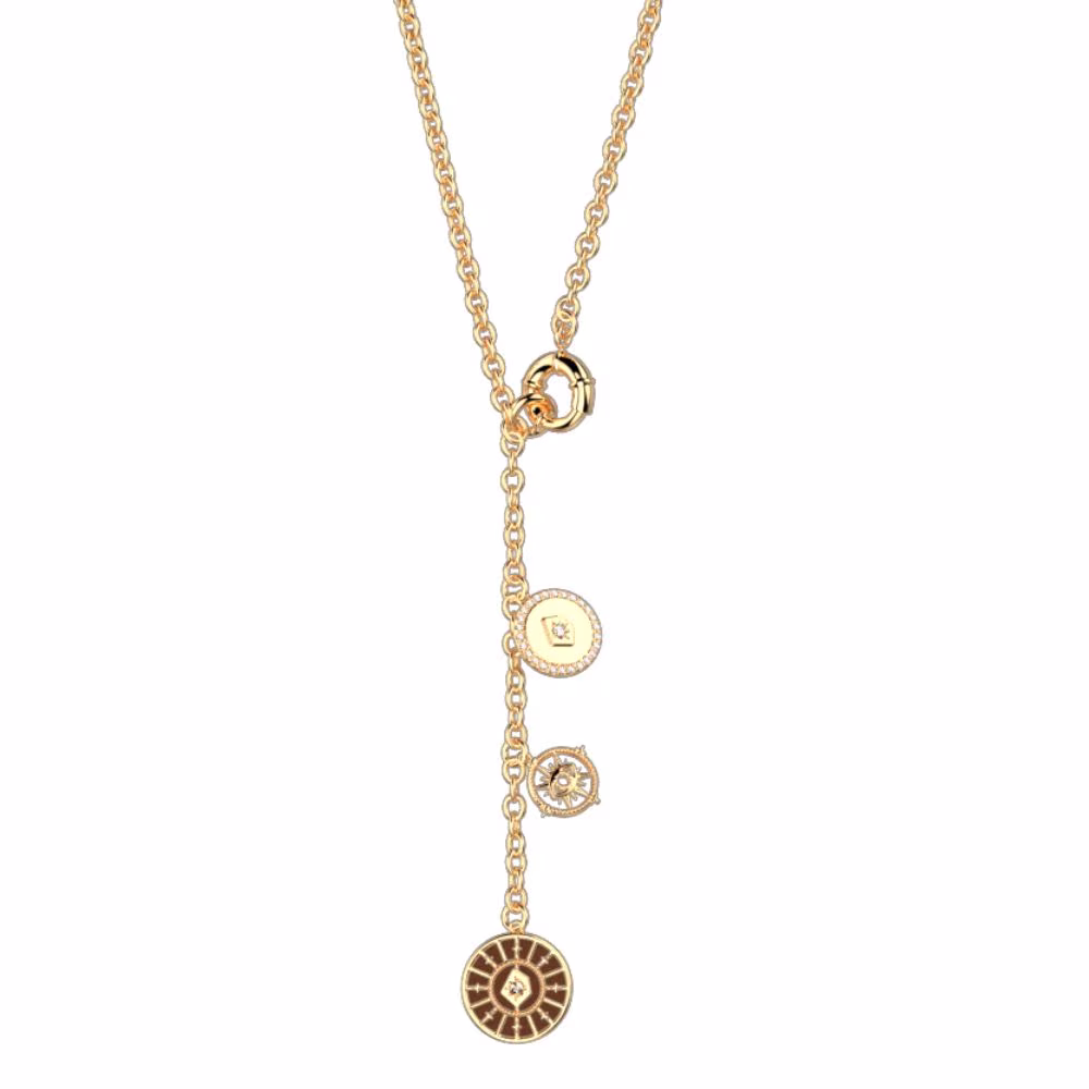 Sa chaîne a maillons ronds et se termine par une délicate le motif Astral, apportant mouvement et légèreté au bijou. Avec son fermoir gros anneau ressort, ce collier cravate s’adapte à toutes vos envies et sublimera votre tenue avec élégance et originalité.[/vc_column_text][/vc_column][/vc_row]