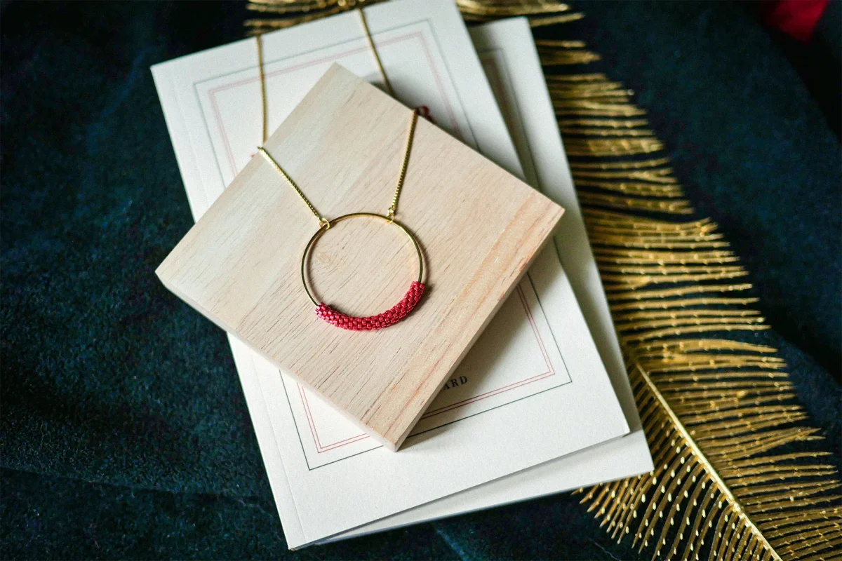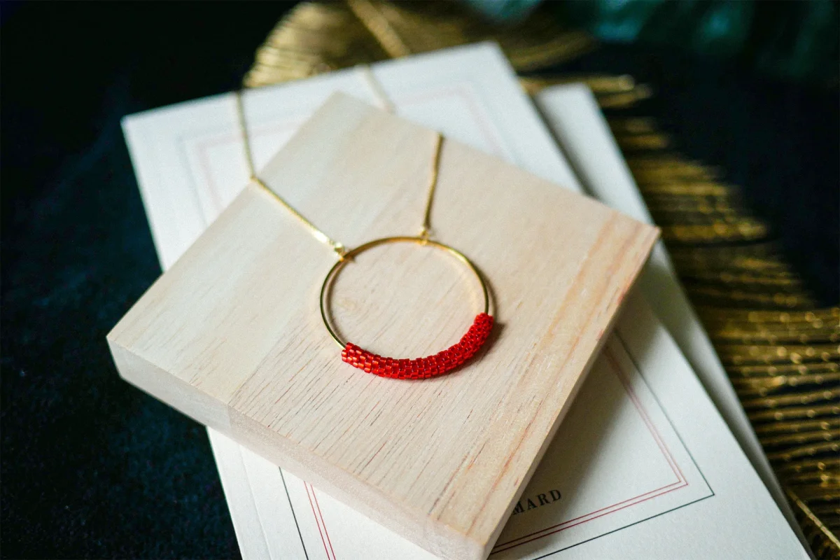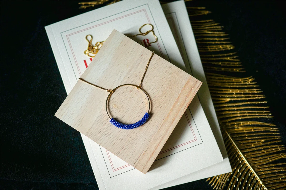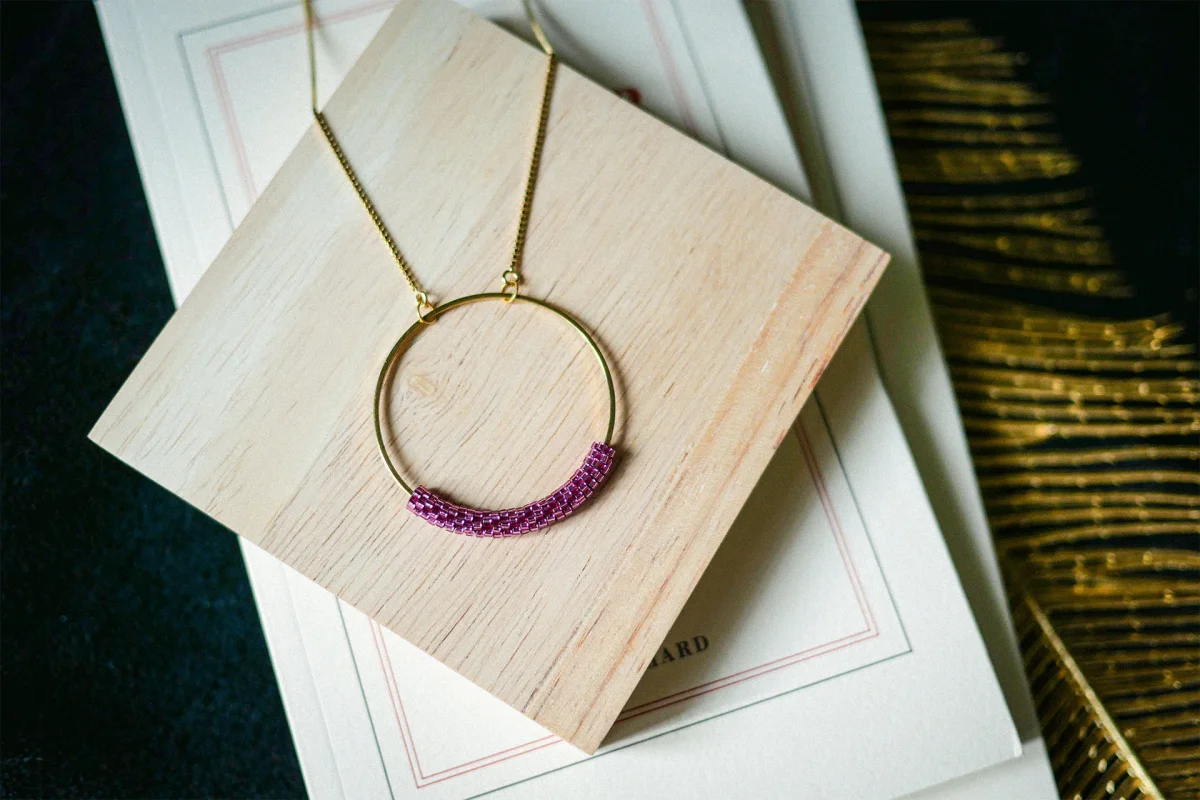 Technique du tissage façon Peyote, qui consiste à enfiler les perles une par une solidement. Cette technique complexe donne un rendu plus résistant, qualitatif et élégant.