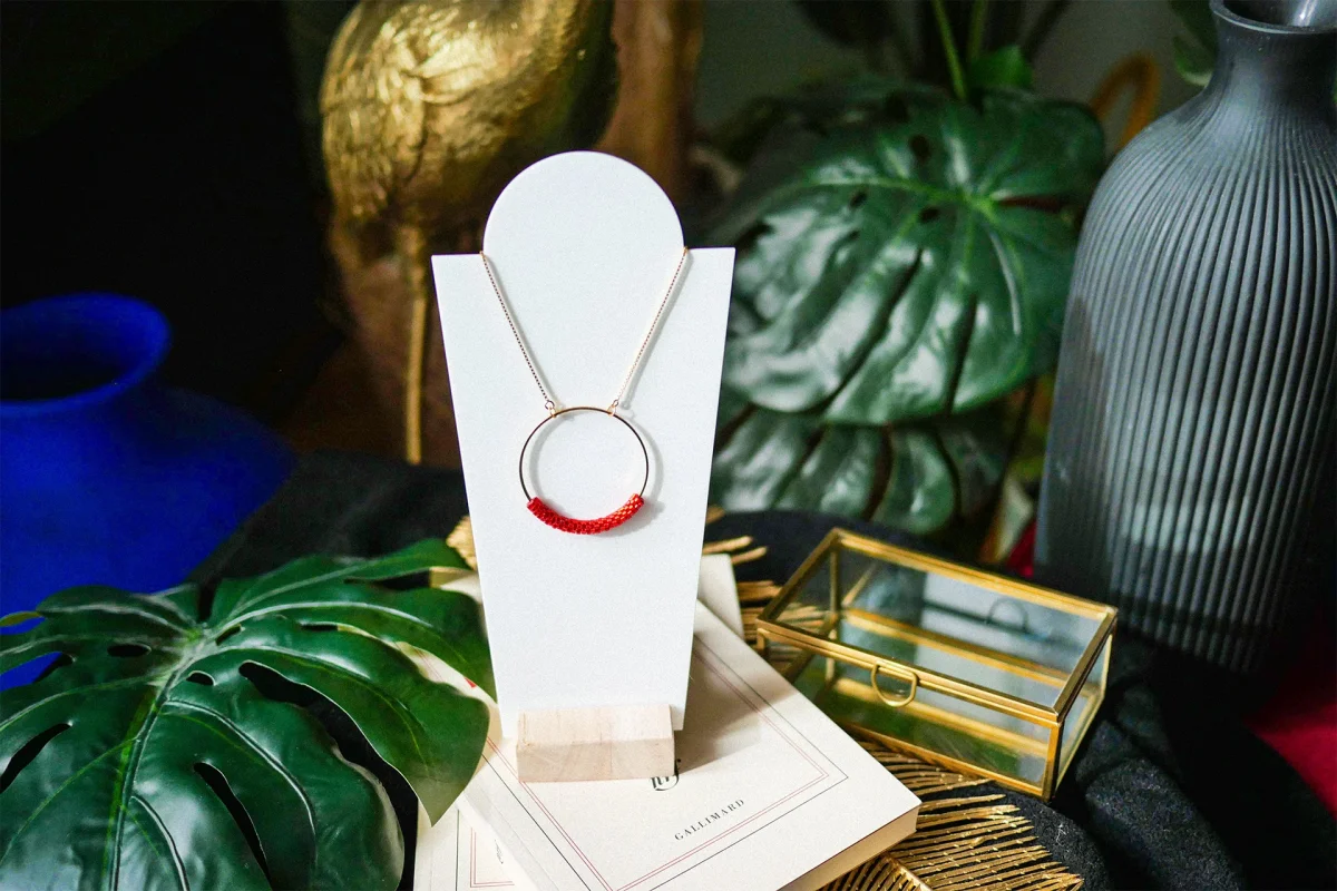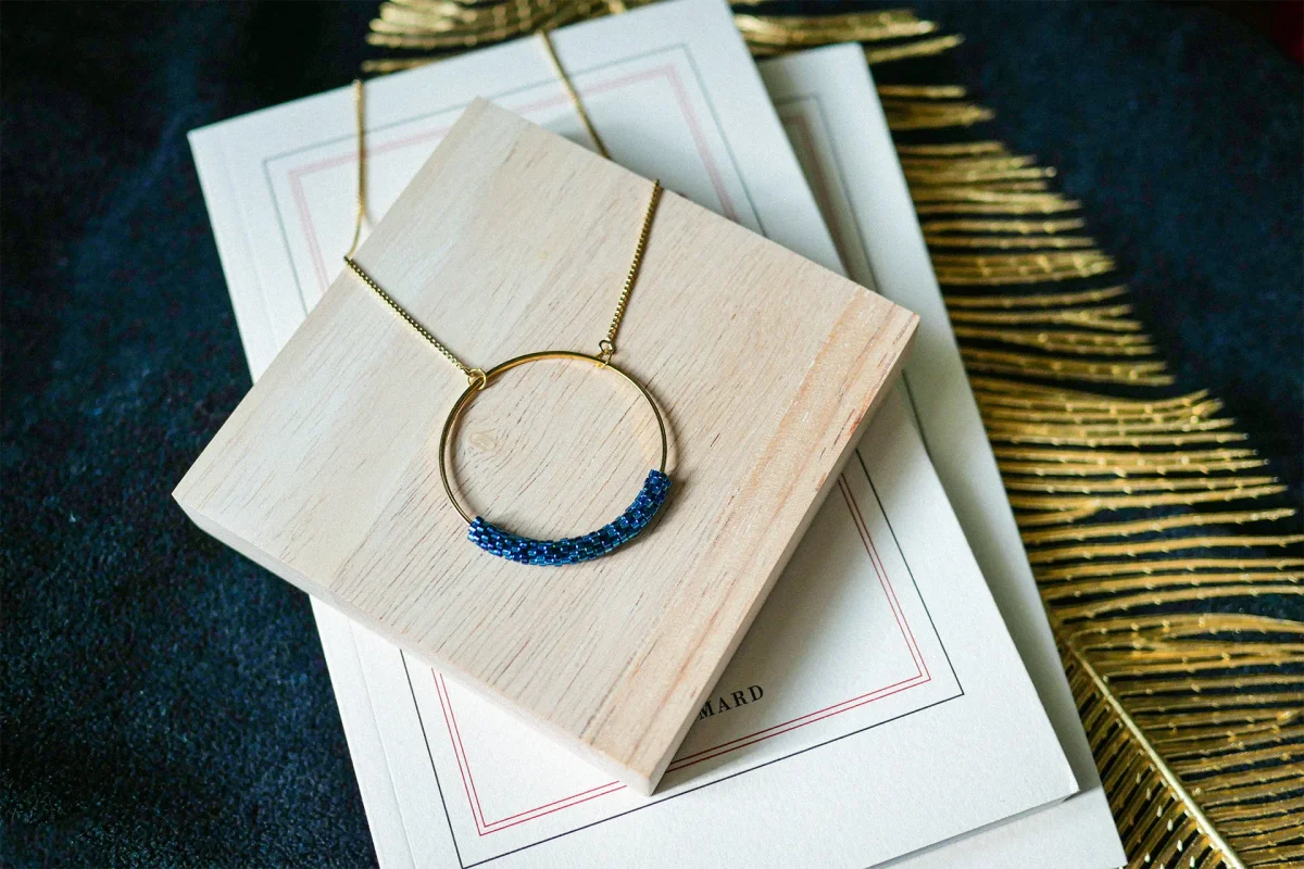 Bijou 100% tissé à la main avec amour ! Matériaux :– Perles Miyuki Delicas 11/0 – Tour de cou maille vénitienne limée Plaqué Or 16 carats- anti-ternissement – Anneau pendentif doré à l’or fin. 24 carats – diamètre 40 mm Longueur totale de la chaîne 40 cm Technique du tissage façon Peyote, qui consiste à […]