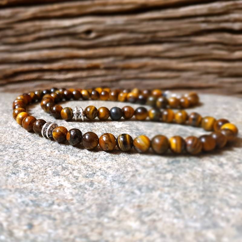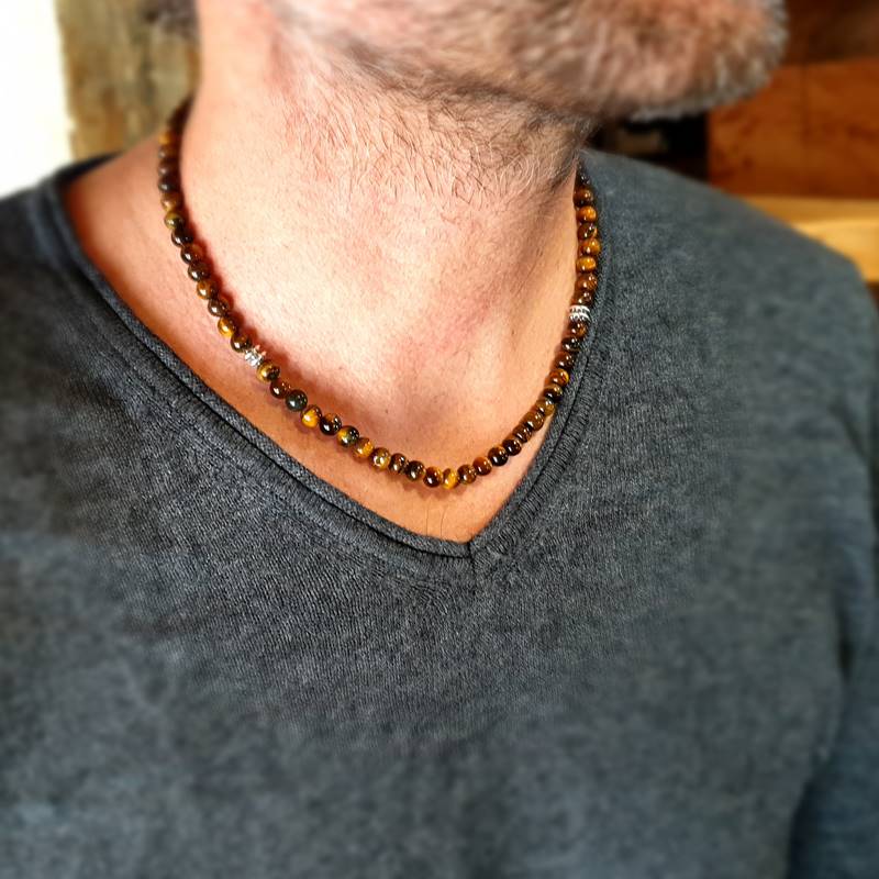 Le collier homme oeil de tigre SURAKSA est un bijou pour homme racé et élégant, aux nuances de jaune doré et de brun. Son nom vient du népalais et signifie protection. En effet l’oeil de tigre est une pierre de protection et de force. Porté court en M ou un peu plus long en L, à vous de faire votre choix. Ce bijou a été fait-main par Mahesh, un artisan népalais, au cœur de Katmandou. Tous nos bijoux sont créés et fabriqués dans une logique de commerce équitable. Grâce à une relation étroite avec le Népal nous avons recherché les artisans les plus en accords avec des créations éthiques et chargées de sens.