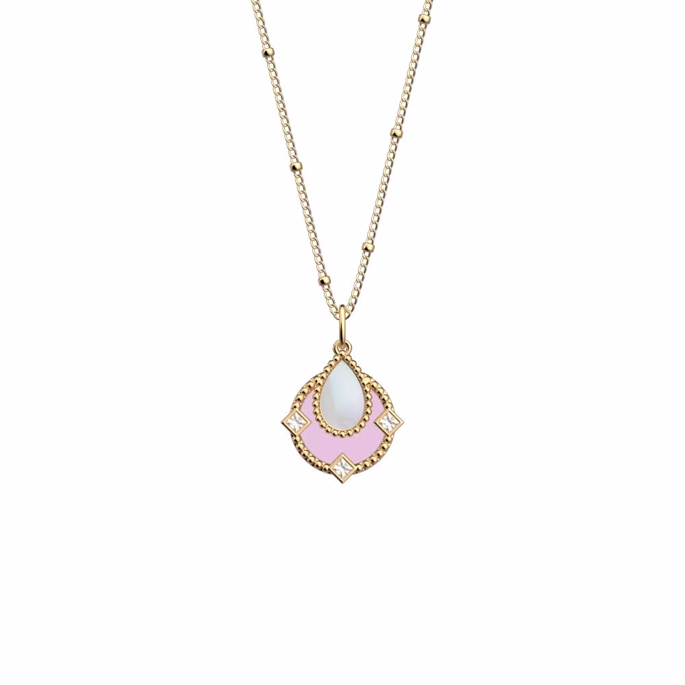 Ce collier raffiné de la collection Constance se distingue par son pendentif délicatement ajouré de 16 mm de diamètre, orné d’un motif goutte en nacre lumineuse et souligné par trois oxydes scintillants pour une touche éclatante.