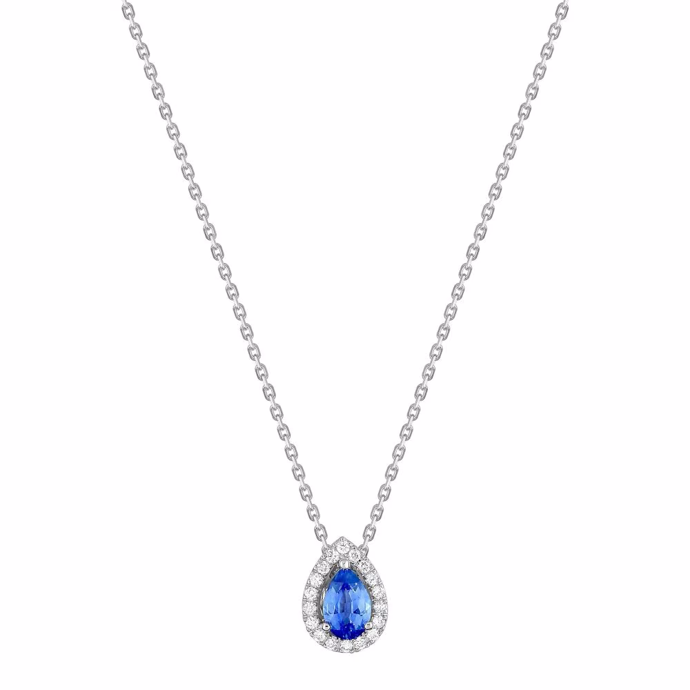 Collier Saphir de Ceylan taille poire et pavage diamants en or blanc Victoria