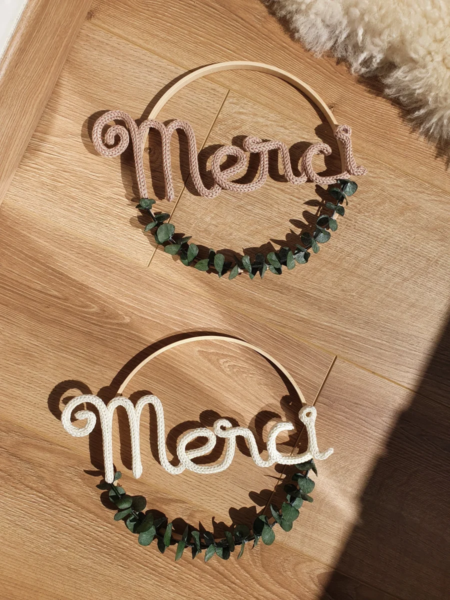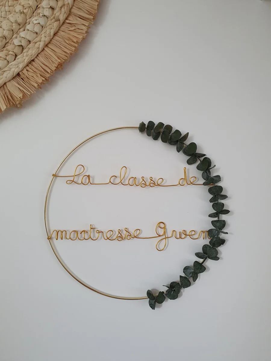 Couronne avec mot.s en tricotin ou en fil d’aluminium doré, argenté, cuivré ou noir dans un cercle blanc, doré ou en bois (le diamètre du cercle dépend de la longueur du mot, il peut aller de 15 à 30cm: 15cm pour un mot à 3 à 4 lettres, 30cm pour un mot à 10 lettres, par exemple).