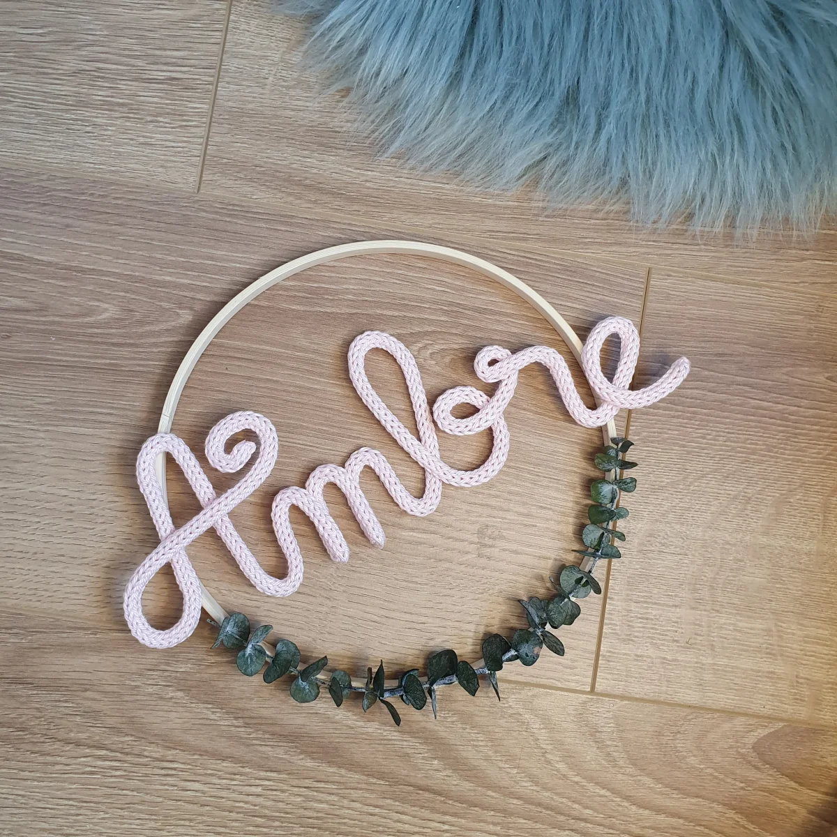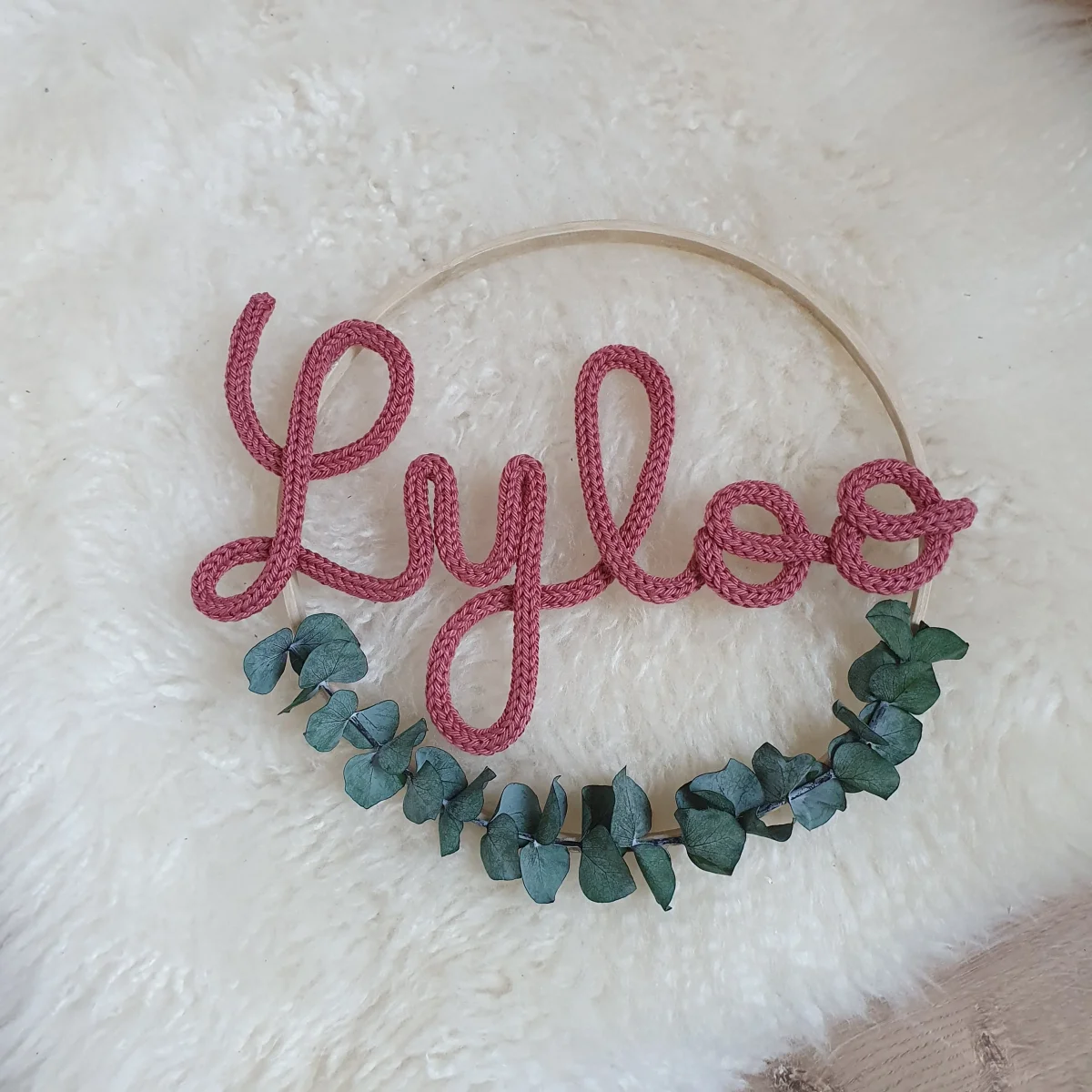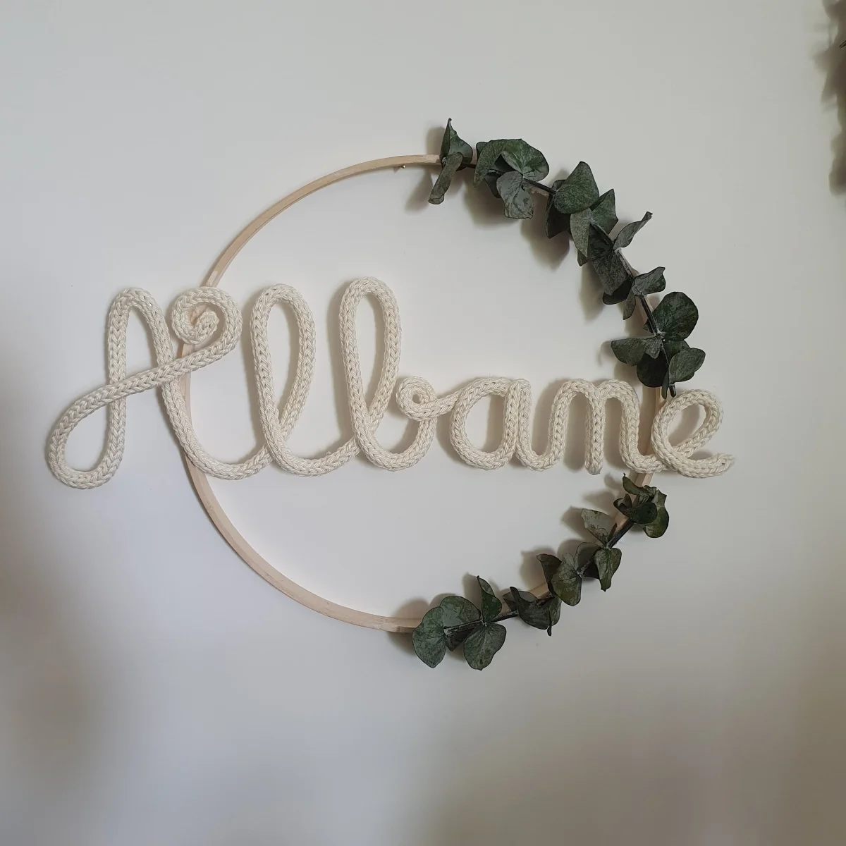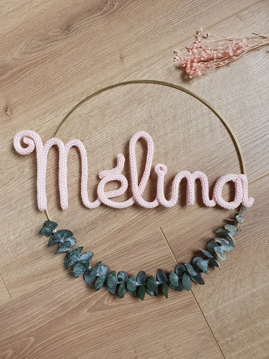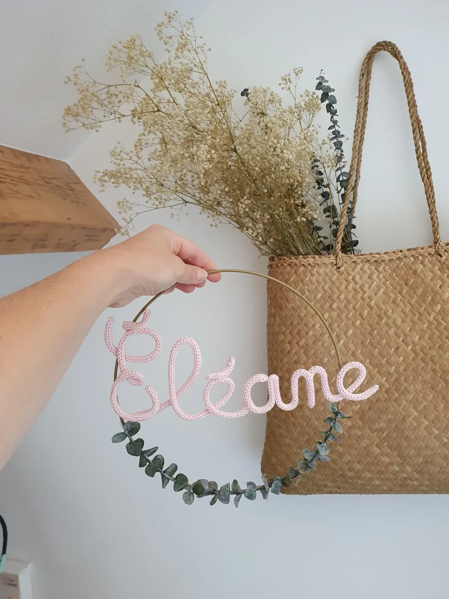 Prénom en tricotin ou en fil d’aluminium doré, argenté, cuivré ou noir dans un cercle blanc, doré ou en bois (le diamètre du cercle dépend de la longueur du prénom, il peut aller de 15 à 30cm: 15cm pour un prénom à 3 à 4 lettres, 30cm pour un prénom à 10 lettres, par exemple).L’eucalyptus […]