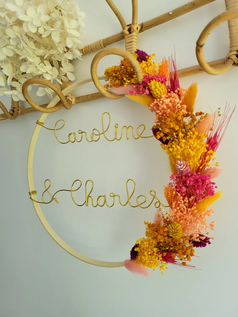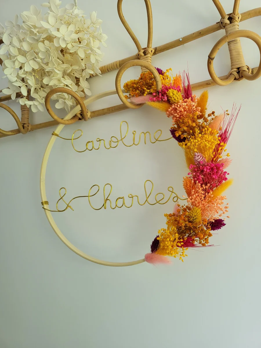 Couronne personnalisée en fleurs séchées – Prénoms des mariés – Déco mariage bohème chic