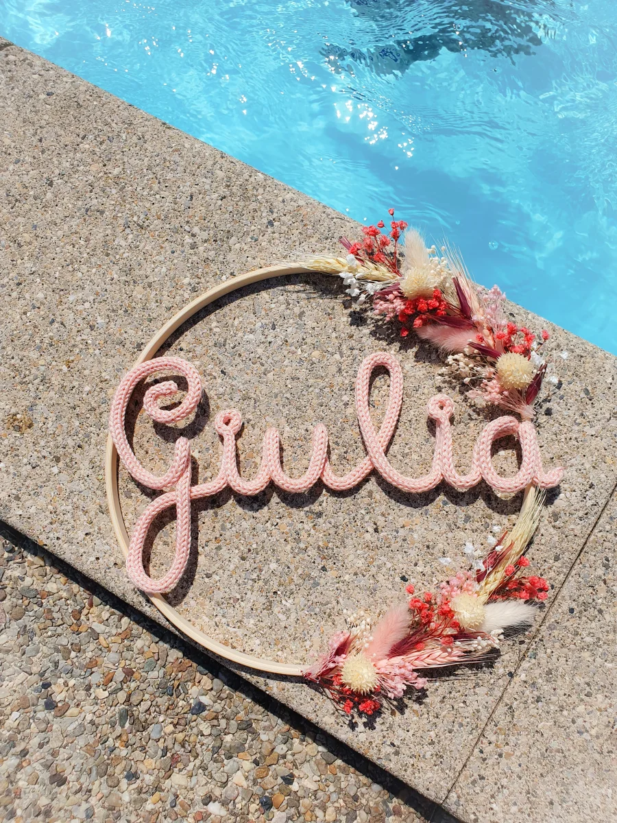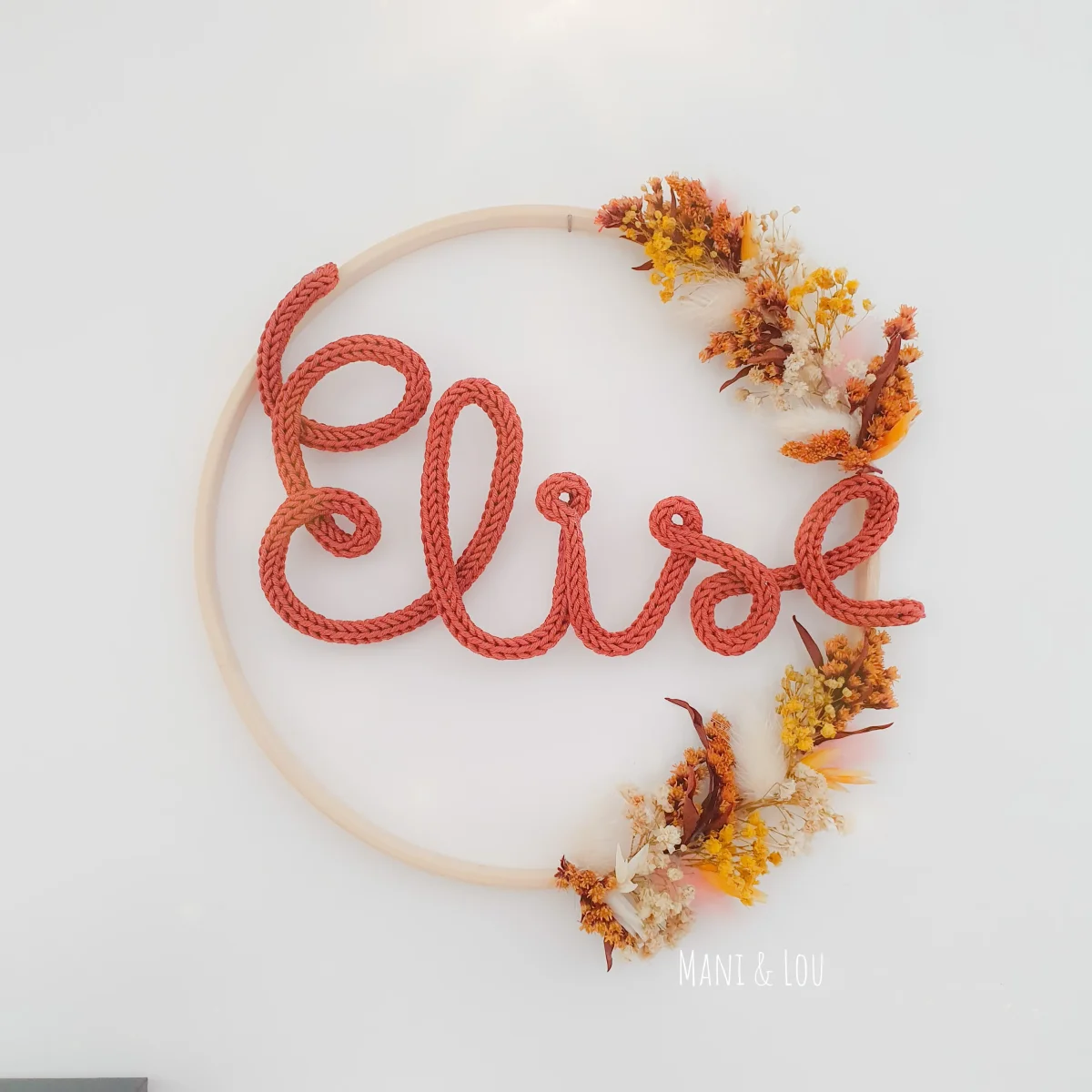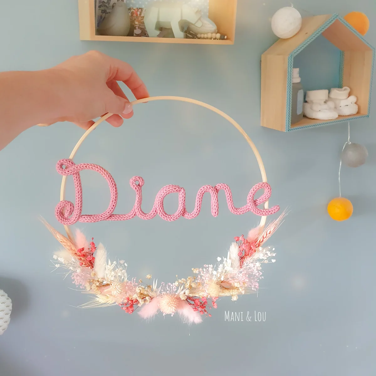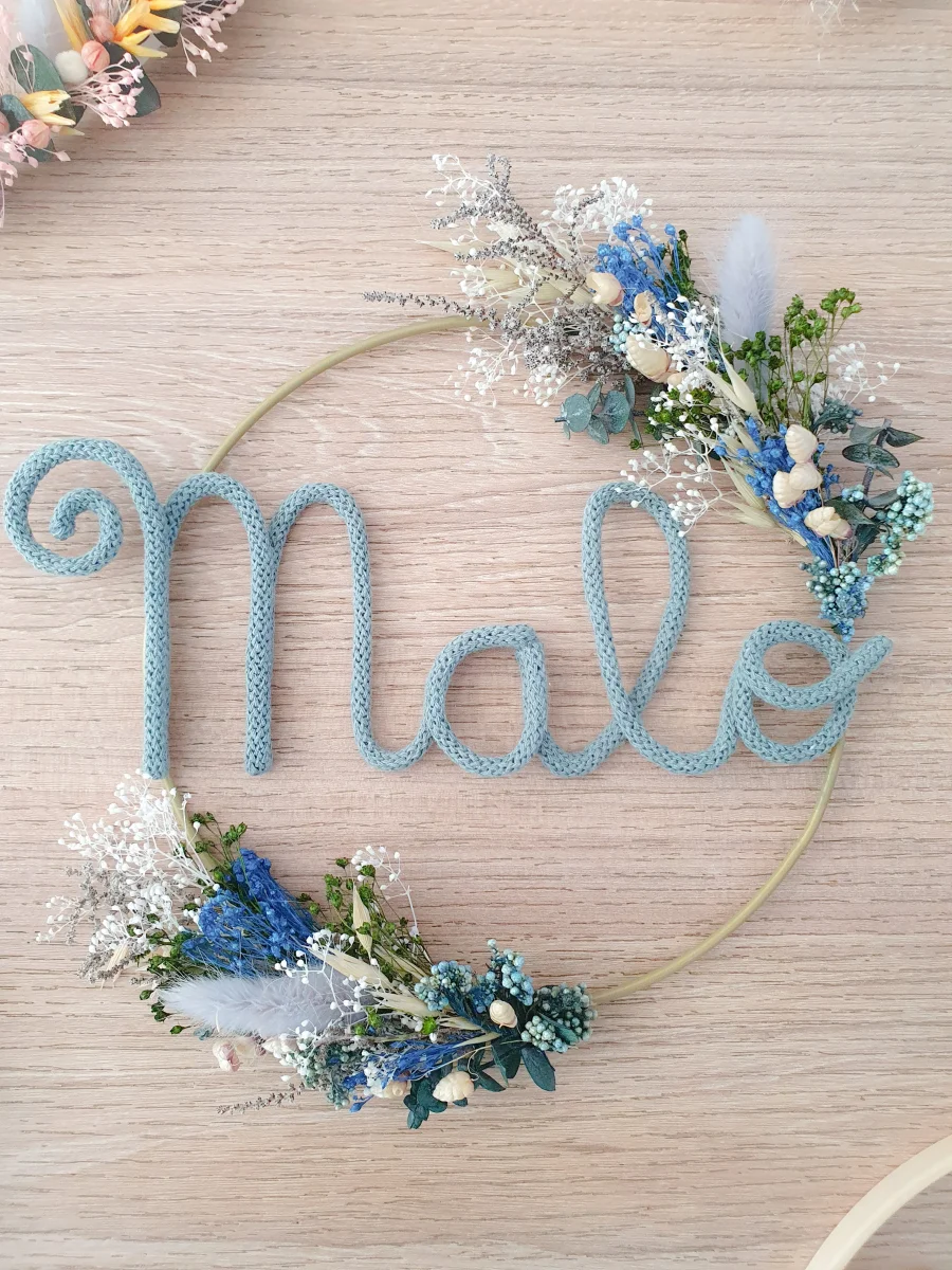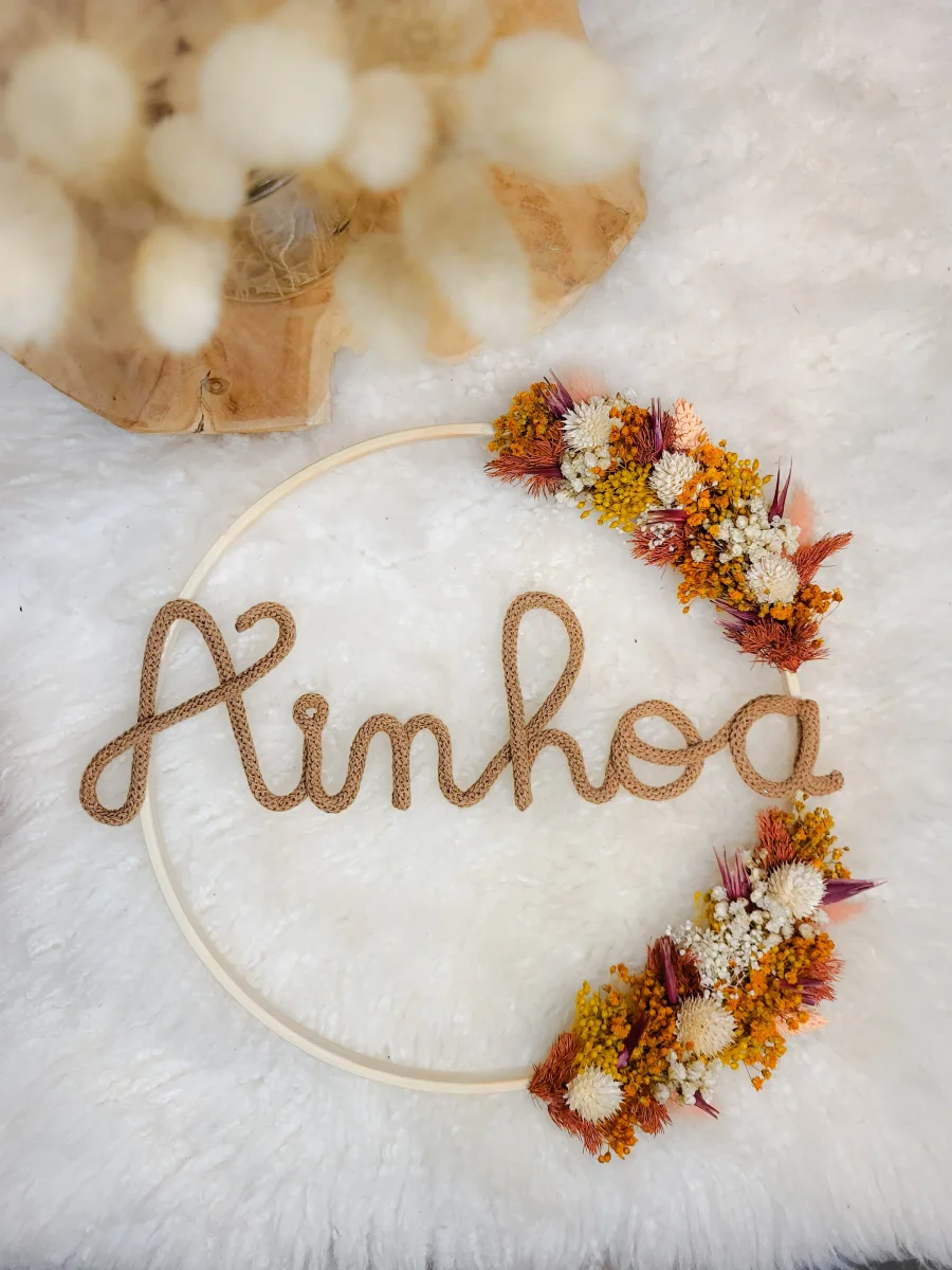 Couronne de fleurs séchées avec prénom en tricotin pour une décoration de chambre d’enfant bohème et poétique.