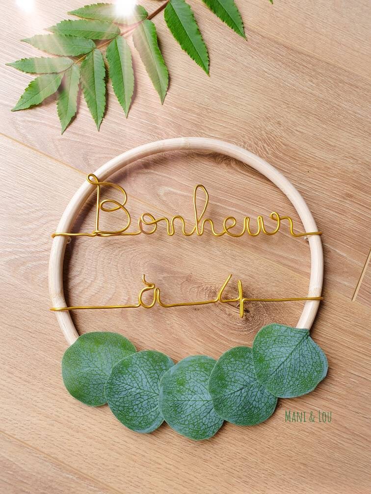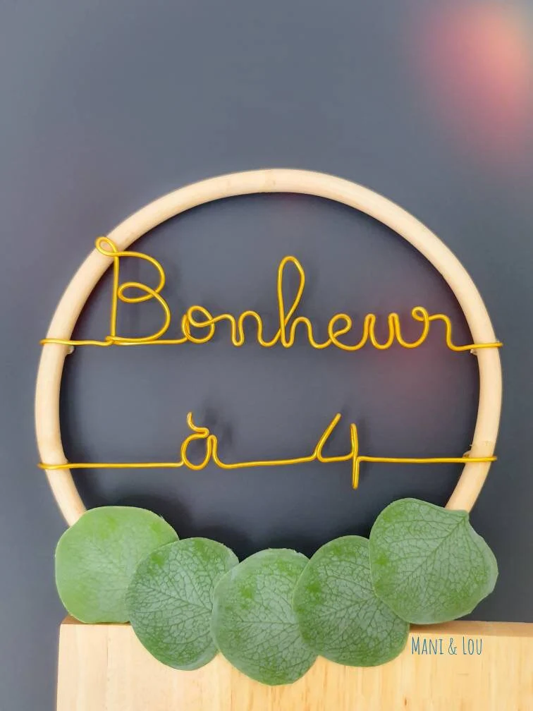 Cette couronne de 20cm de diamètre unique peut être personnalisée comme vous le voulez: « Bonheur à 2, bonheur à 3, à 5 », etc… ou tout autre chose: juste « Bonheur », « Amour », le nom de votre famille, vos prénoms…
