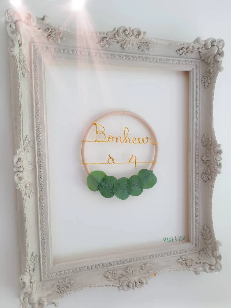 Alors imaginez la décoration murale personnalisée vous souhaitez et demandez-la moi! Tout est possible. La seule limite est celle de votre imagination! Avez vous déjà pensé à accrocher une jolie couronne en bois unique et originale à votre mur avec un mot écrit en fil d’aluminium doré? Vous l’avez trouvé!