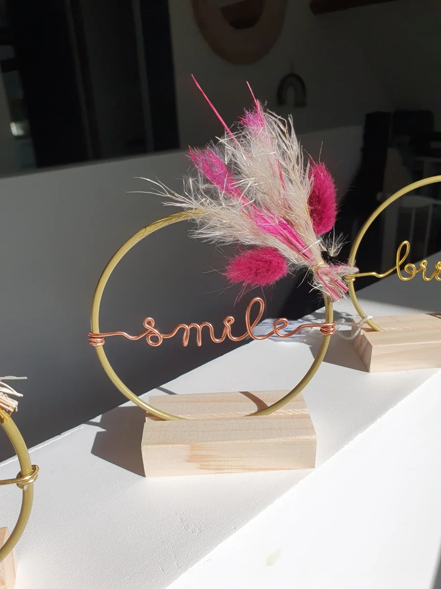Tout est personnalisable: le.s mot.s et leur couleur: choisissez entre l’écriture dorée, noire, argentée, or rose ou cuivrée.