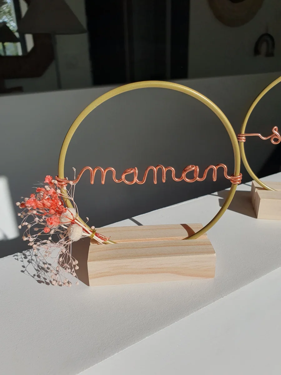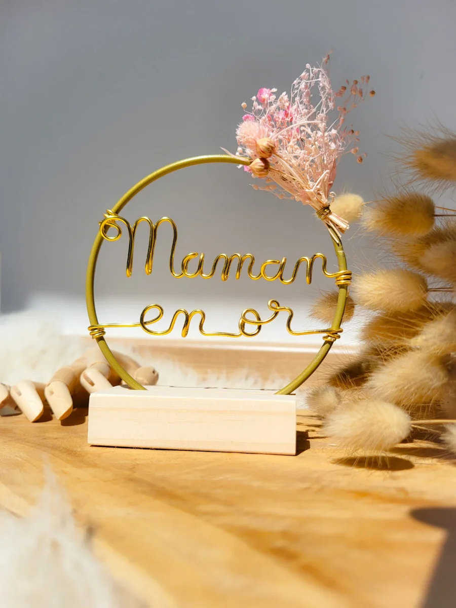 Une jolie petite couronne dorée à personnaliser avec des mots doux pour votre maman ou encore les prénoms de ses enfants: jusqu’à 3 mots ou prénoms.