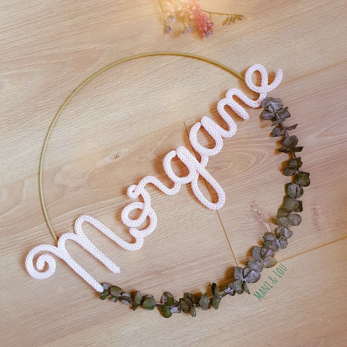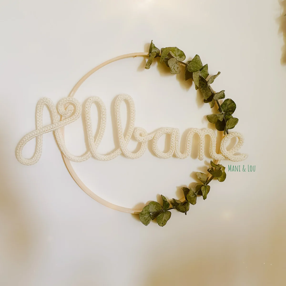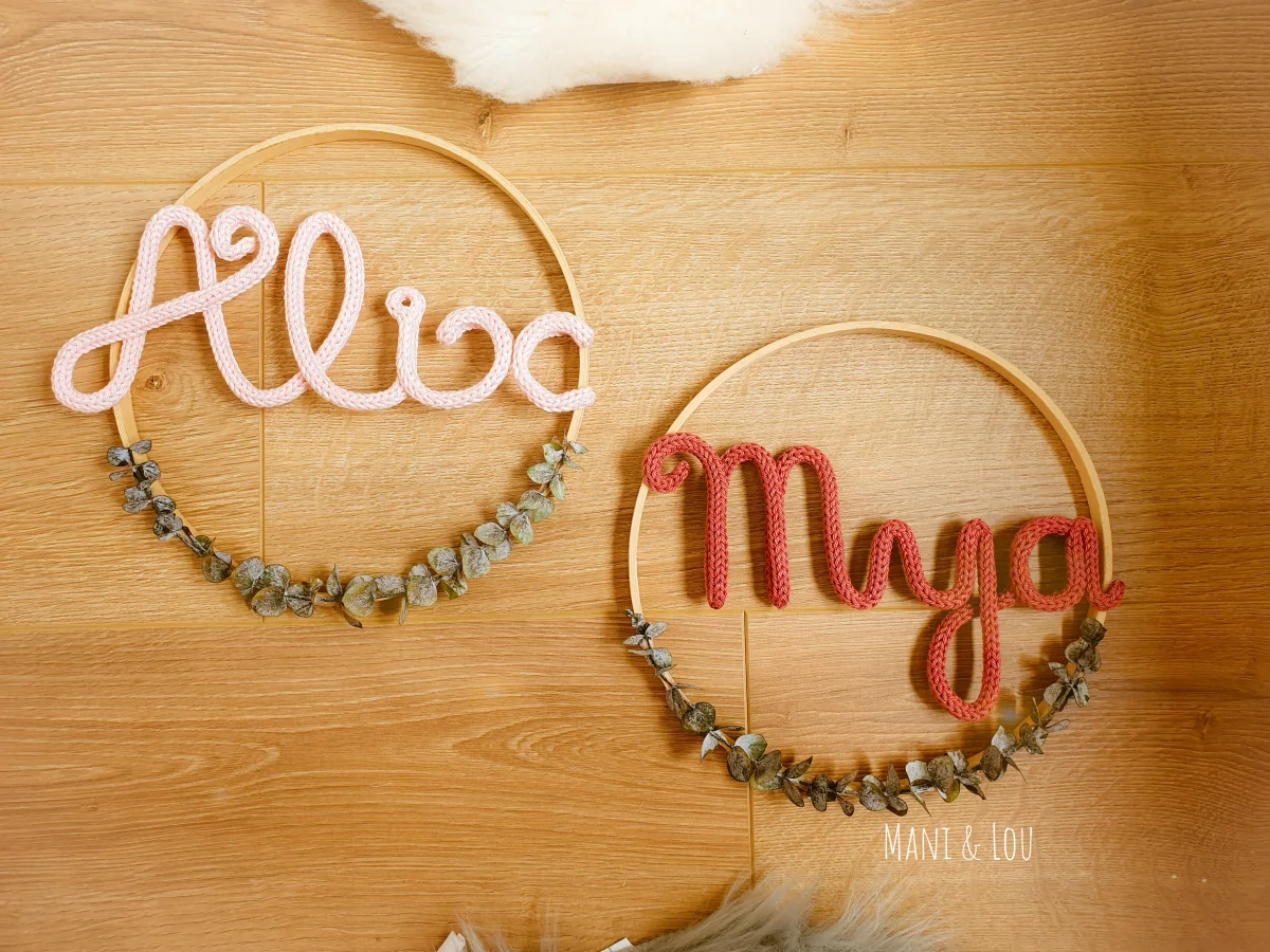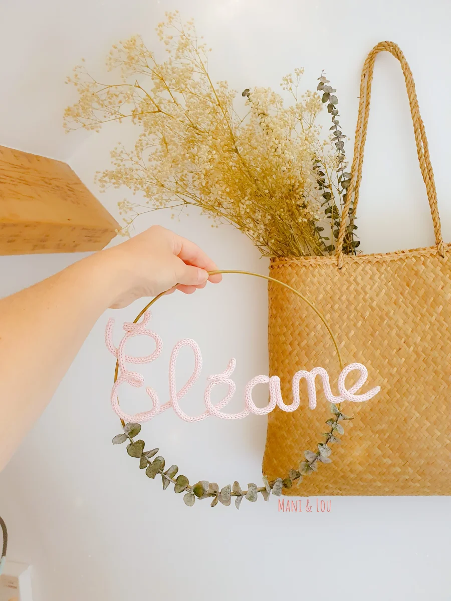 Couronne d’eucalyptus avec prénom en tricotin, le cadeau idéal pour une naissance, un anniversaire, un baptême, Noël, etc. Prénom en tricotin et fil d’acier galvanisé dans cercle métal blanc ou doré ou en bois (le diamètre du cercle dépend de la longueur du prénom, il peut aller de 15 à 30cm: 15cm pour un prénom […]
