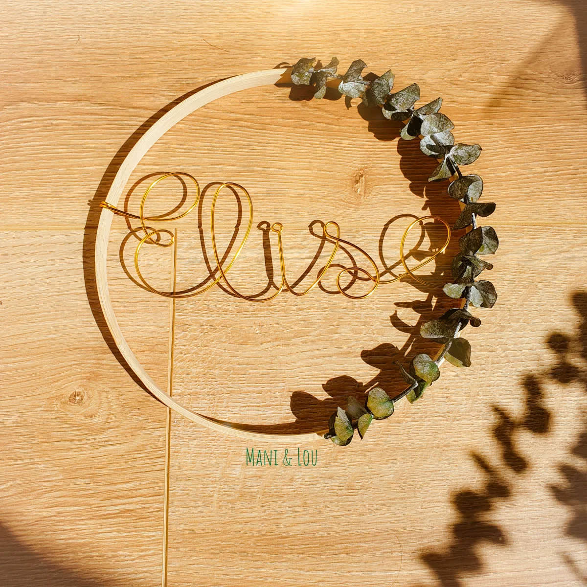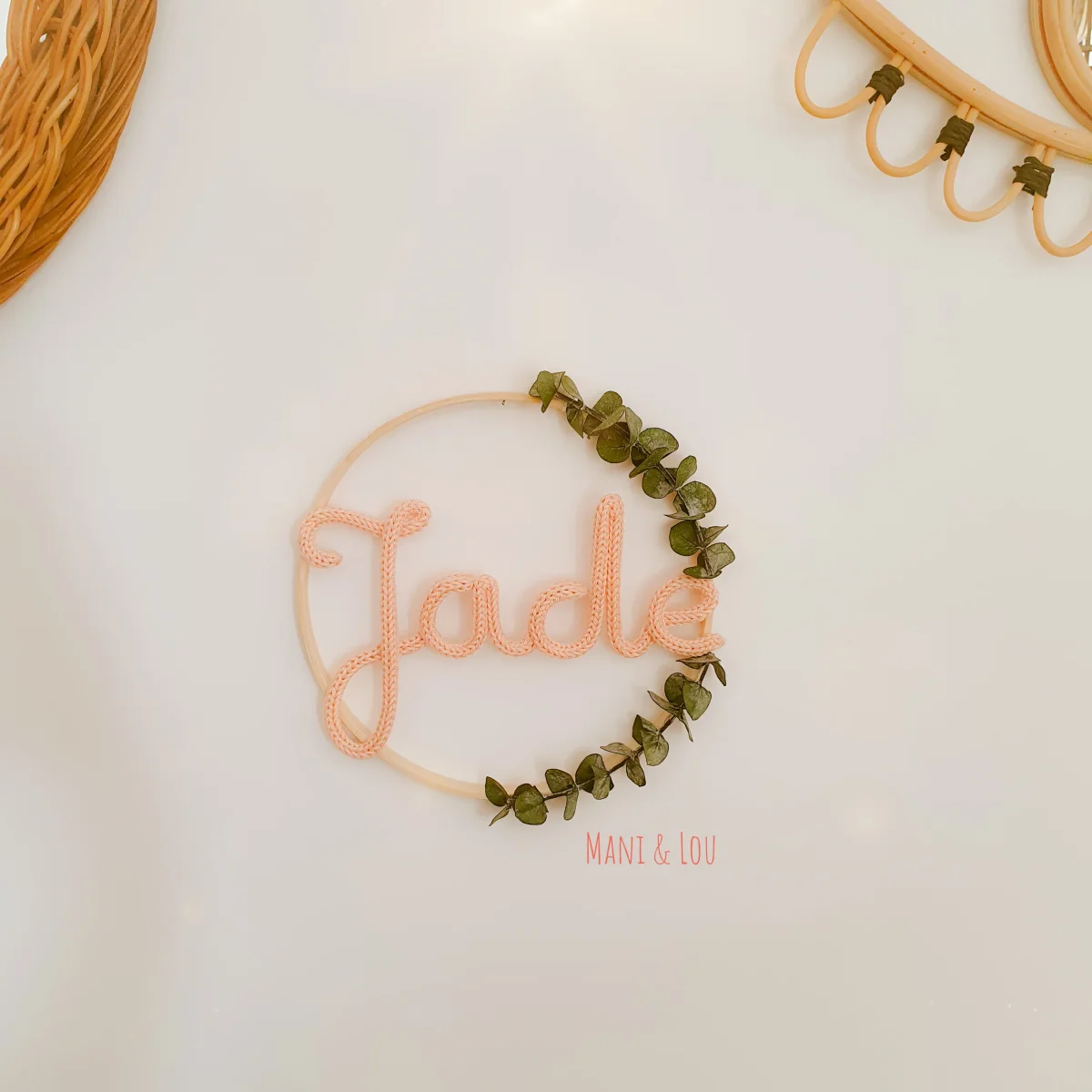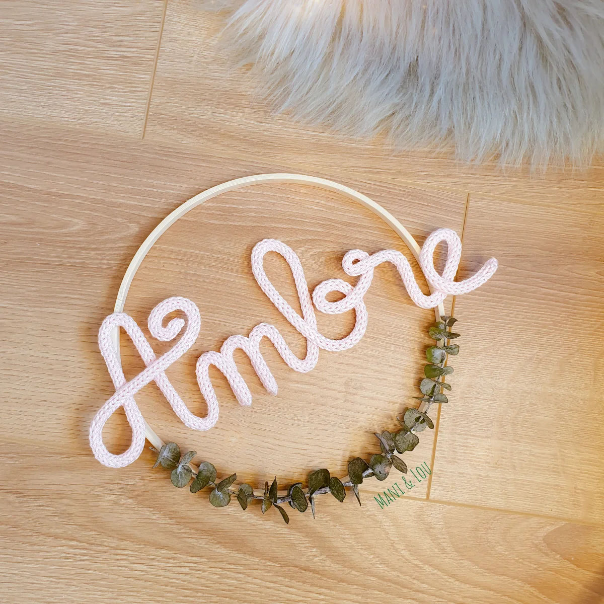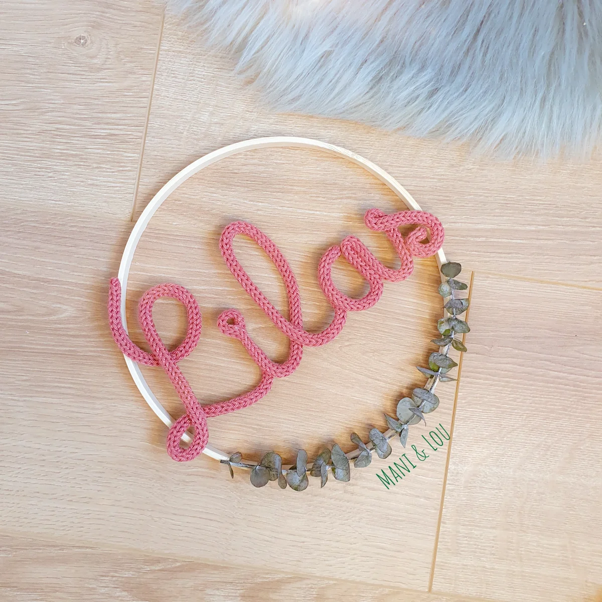 Couronne d’eucalyptus avec prénom en tricotin, le cadeau idéal pour une naissance, un anniversaire, un baptême, Noël, etc. Prénom en tricotin et fil d’acier galvanisé dans cercle métal blanc ou doré ou en bois (le diamètre du cercle dépend de la longueur du prénom, il peut aller de 15 à 30cm: 15cm pour un prénom […]