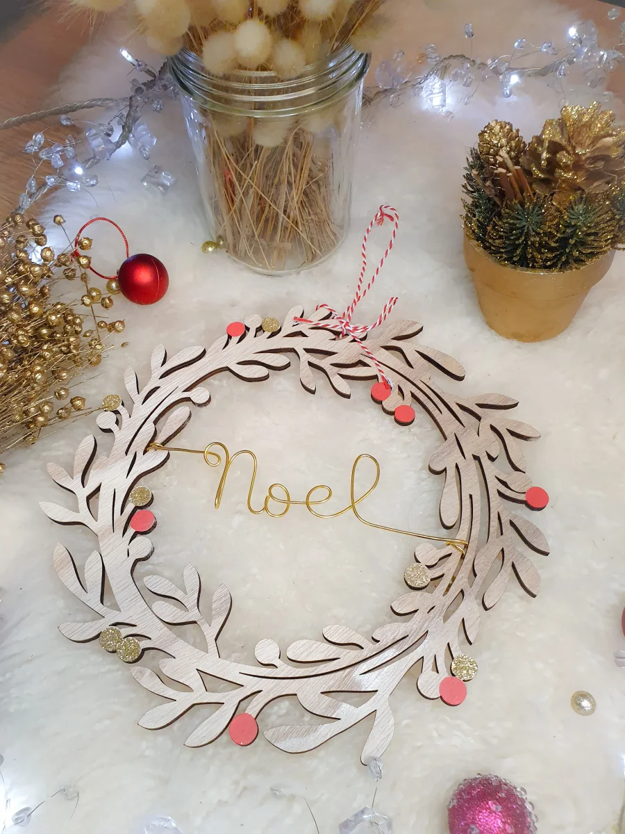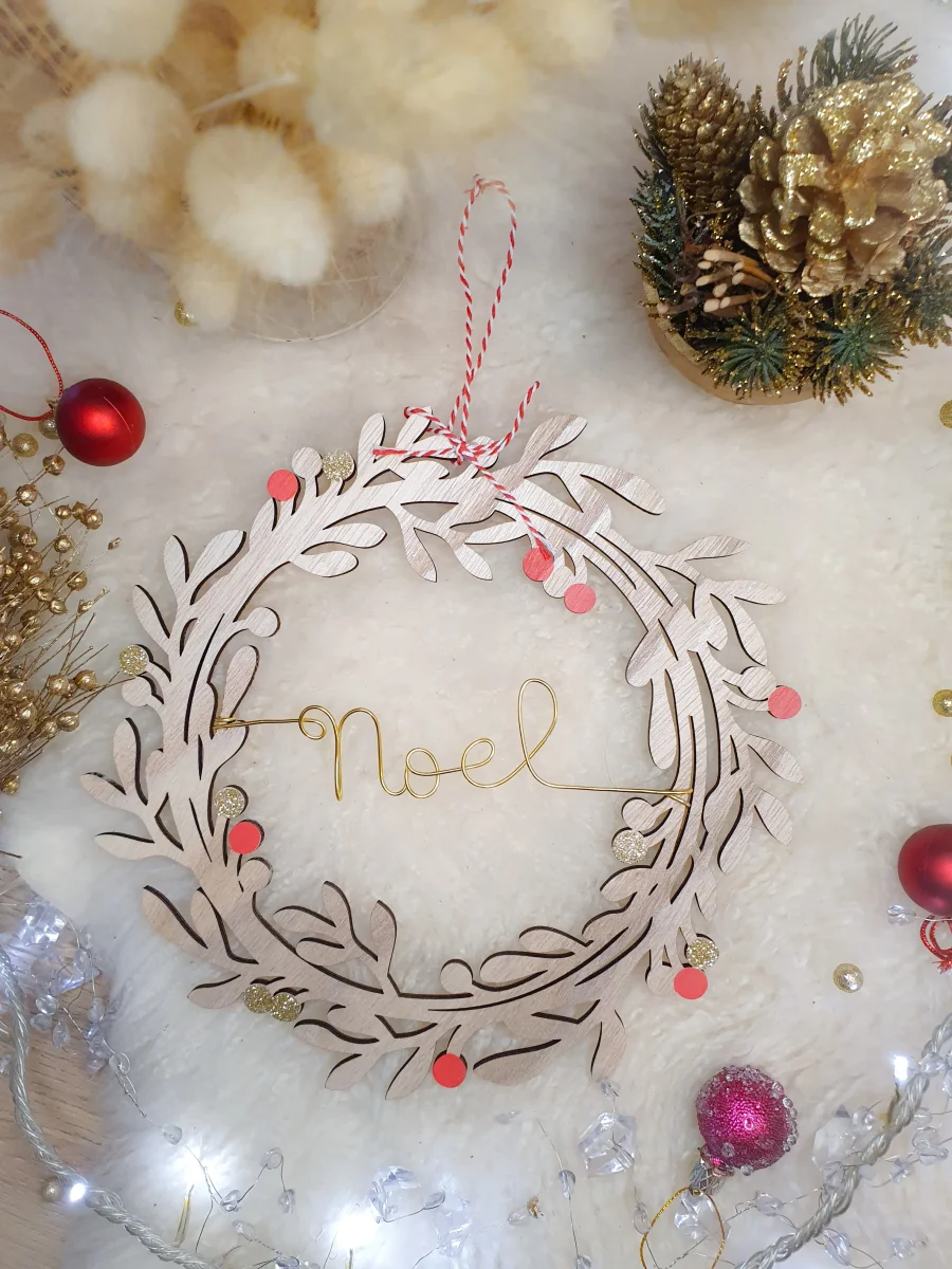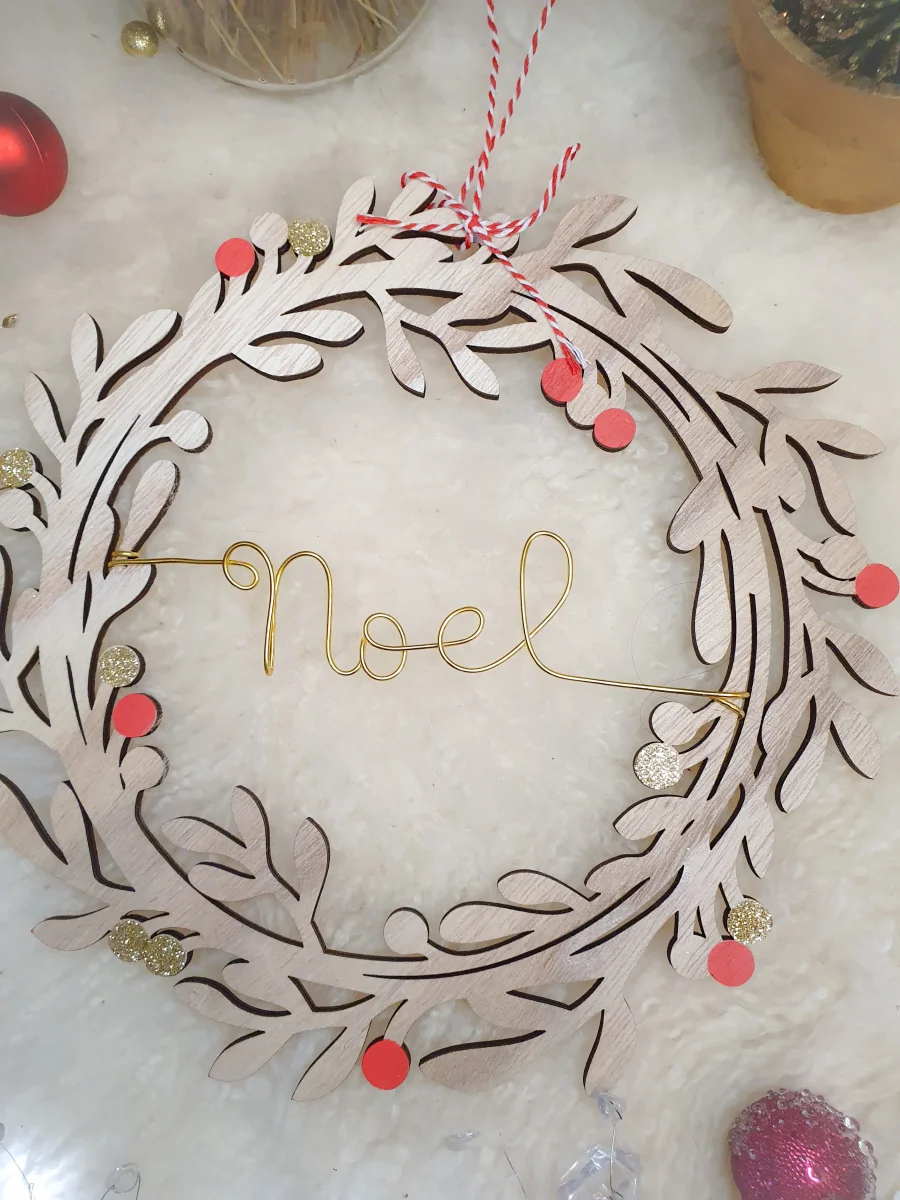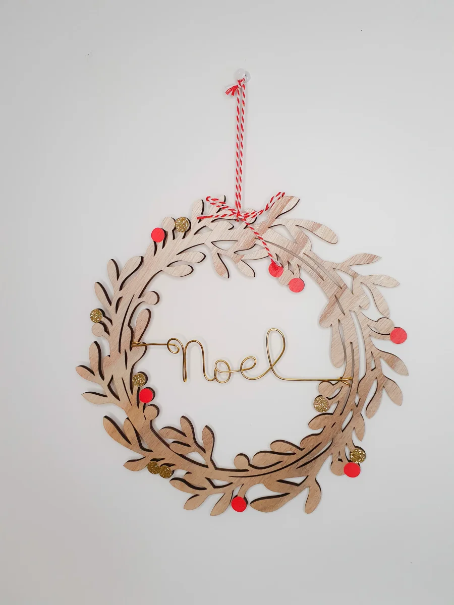 Couronne personnalisable avec le ou les mots de votre choix: cela peut être un ou plusieurs prénoms, le nom de votre famille ou simplement « Joyeux Noel ».