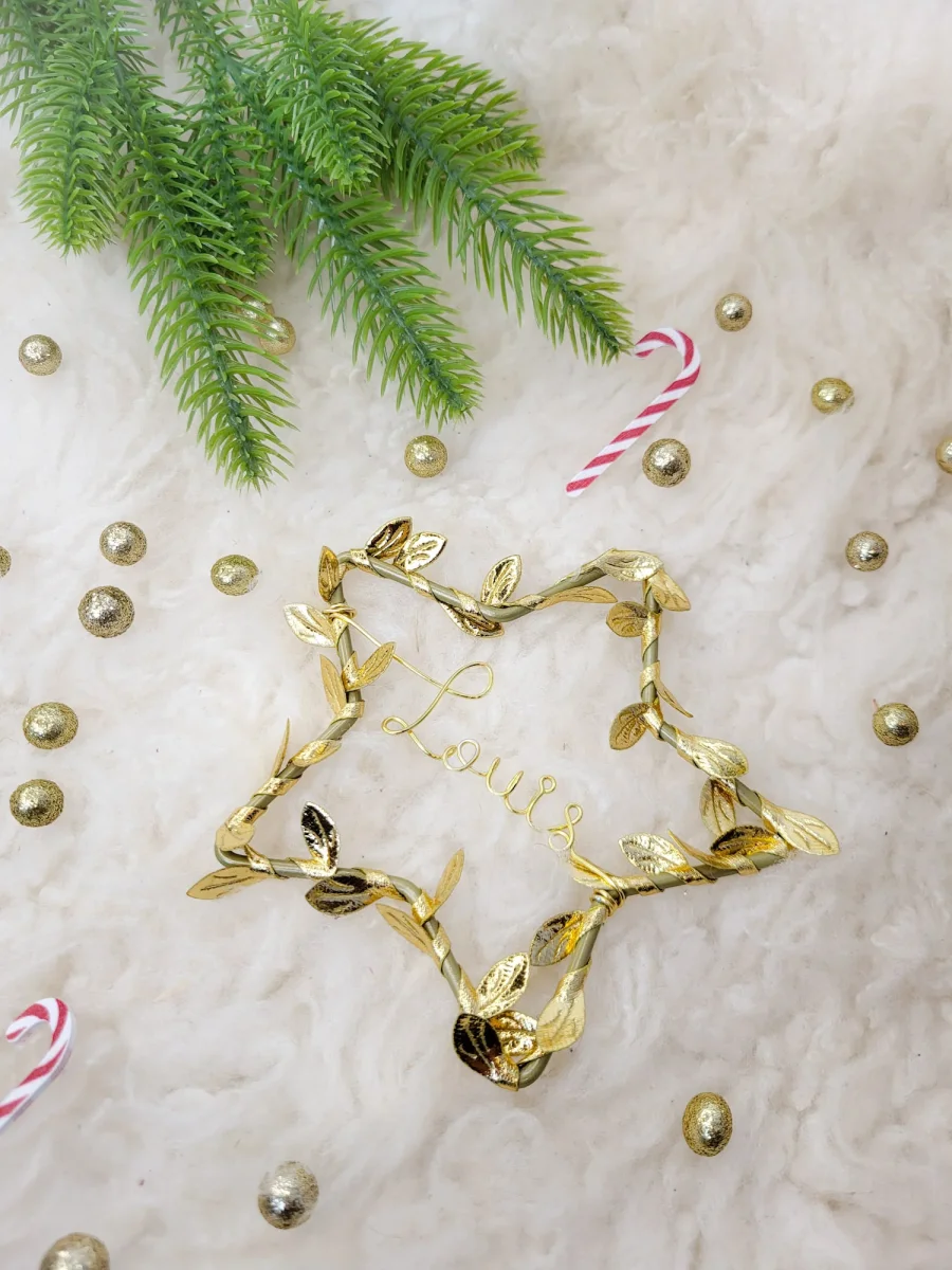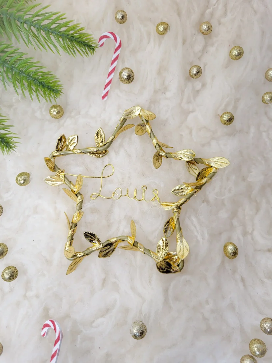 Décoration ornement de sapin de Noël en forme d’étoile feuilles dorées à suspendre personnalisable avec prénom ou mot