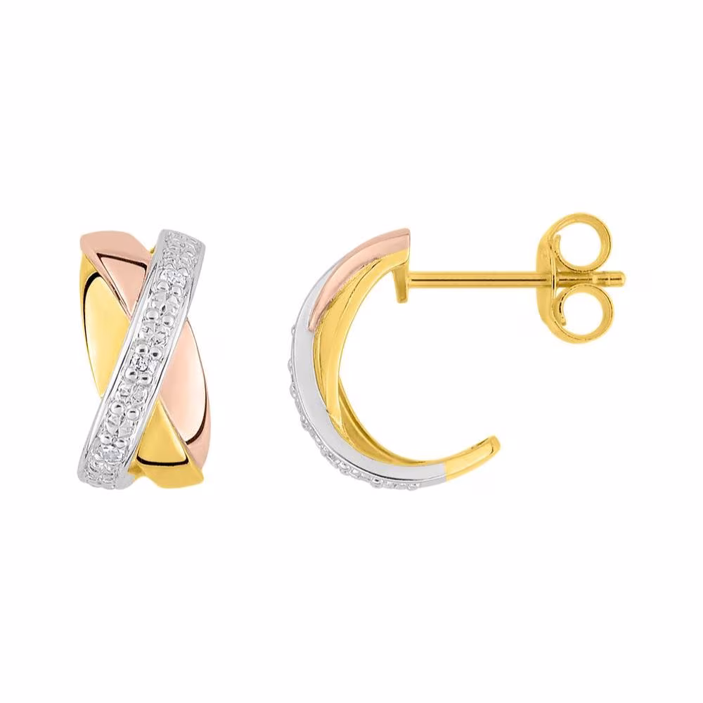 Élégance intemporelle et raffinement contemporain se rencontrent dans ces demi-créoles en or jaune, or blanc et or rose 18 carats, subtilement entrelacés. La rangée centrale en or blanc, mise en lumière par une finition diamantée, accueille trois diamants sertis pour un total de 0,036 carat (qualité HP1), apportant une touche lumineuse et précieuse.