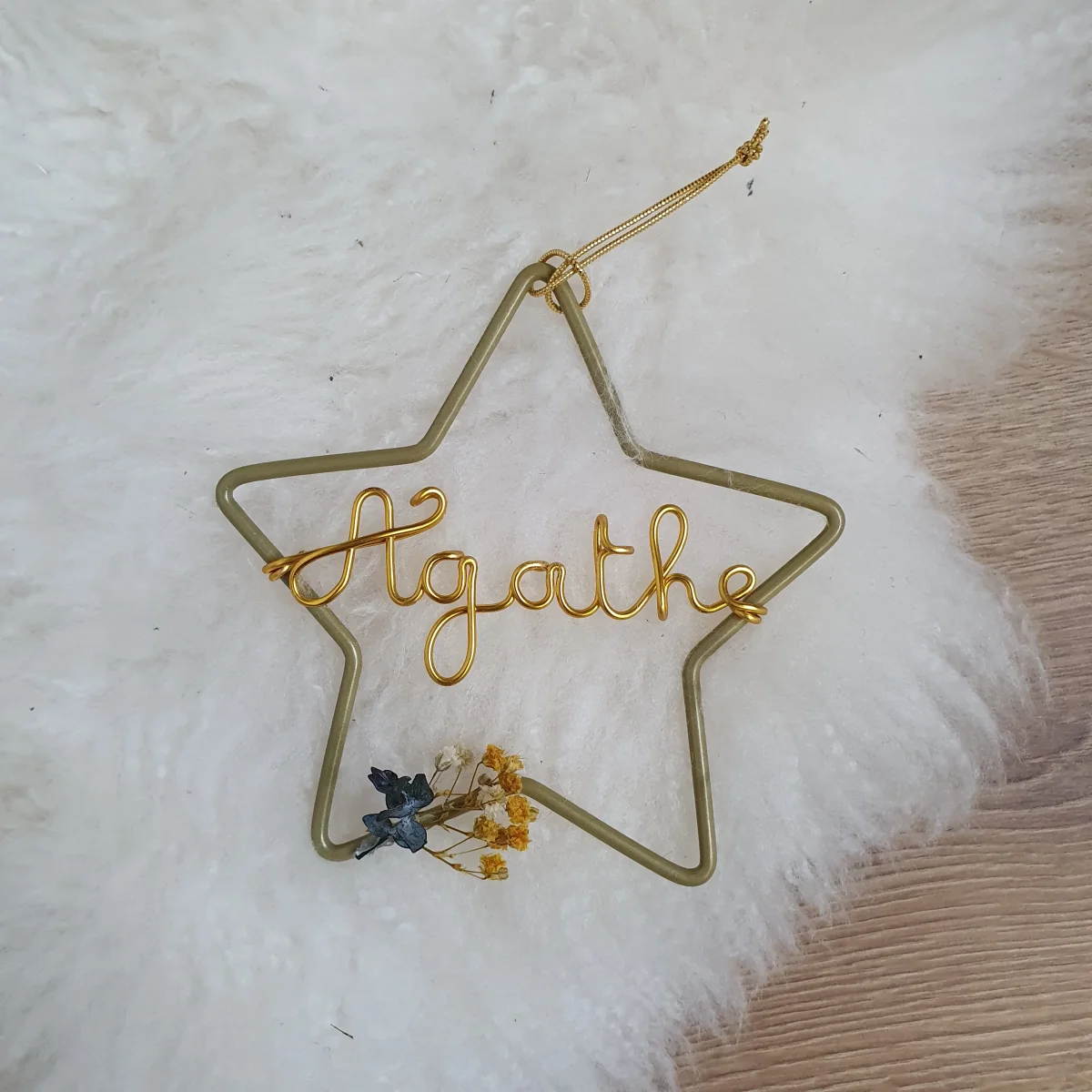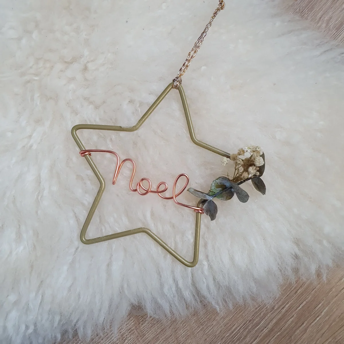Décoration de sapin de Noël personnalisée en forme d’étoile dorée avec écriture en fil d’aluminium noir, doré ou cuivré et décoré de quelques feuilles et fleurs séchées.