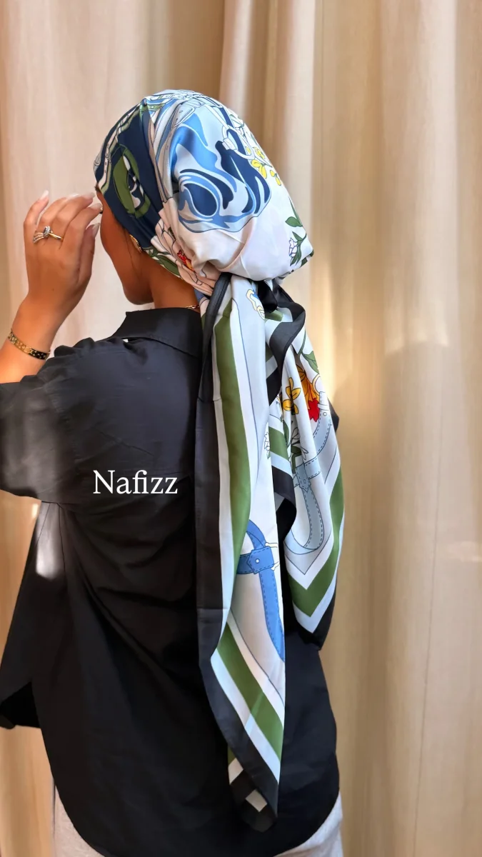 grand carré polyester 120cm x 120cm nous portons en dessous un bonnet en coton. et un chouchou volume pour le maintien ,disponible sur notre site