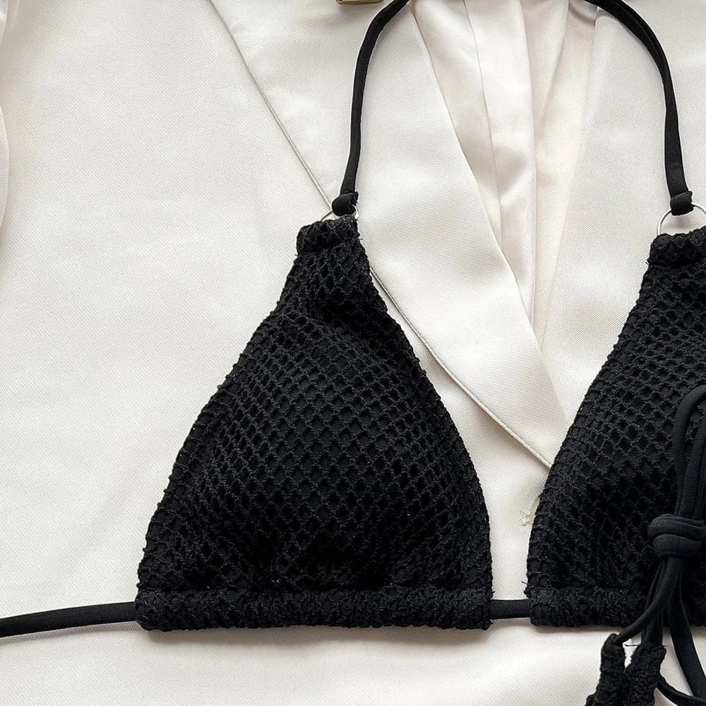 Succombez à l’élégance bohème de notre bikini crochet, véritable pièce signature pour l’été. Ce maillot de bain femme deux pièces allie parfaitement le style artisanal du tricot et la sensualité d’une coupe triangle halter minimaliste. Sa finition crochet façon filet de pêche apporte une dimension texturée contemporaine tout en vous garantissant un maintien optimal grâce à ses coussinets intégrés. La culotte bikini taille basse avec liens ajustables s’adapte parfaitement à toutes les morphologies pour un look balnéaire irrésistible !
