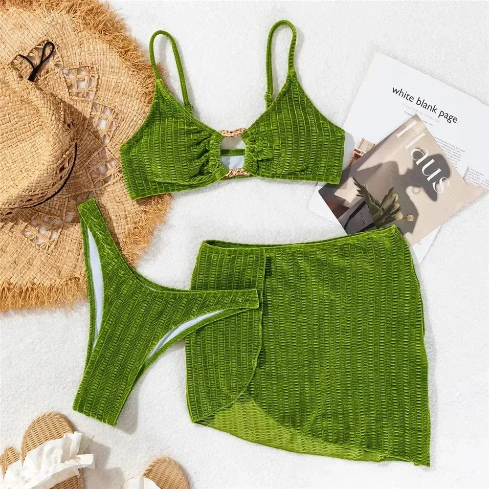 Révélez votre silhouette avec notre maillot de bain femme 3 pièces vert en velours. Ce maillot trois pièces avec anneau métallique est conçu pour sublimer votre corps avec sa taille basse et sa coupe brésilienne. Fabriqué en polyester et spandex de haute qualité, ce bikini vert s’adapte parfaitement à votre morphologie tout en offrant un confort optimal grâce à son style sans armature avec coussinets intégrés. Son design plage tendance et sa couleur émeraude captivante feront de vous la reine de la plage pour la saison 2025 ! Prête pour des vacances inoubliables sous le signe de l’élégance ?