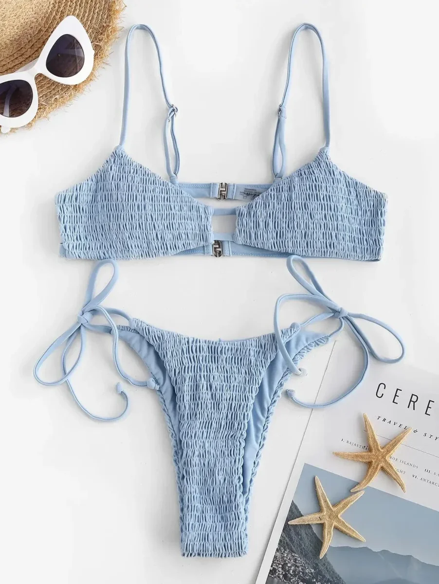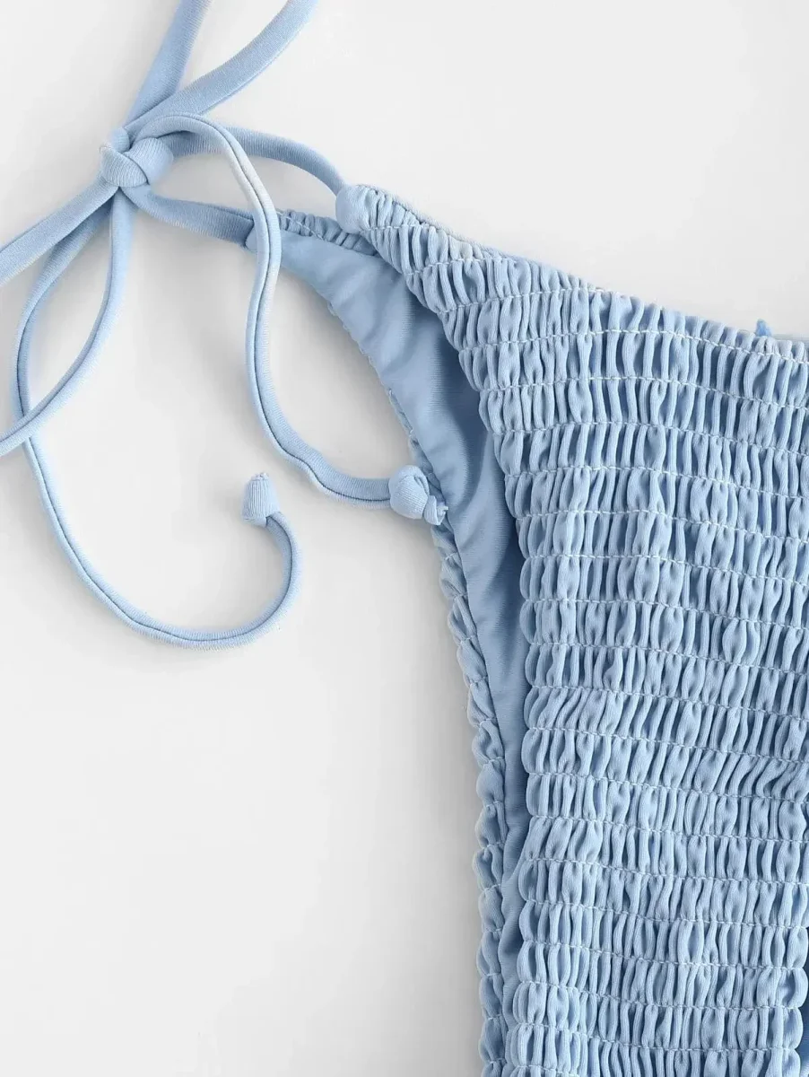 Plongez dans l’élégance estivale avec ce bikini bleu pensé pour sublimer votre silhouette. Sa coupe brésilienne audacieuse et ses bretelles spaghetti ajustables vous garantissent un maintien parfait tout en dévoilant votre féminité avec raffinement. Le système de laçage et les détails froncés apportent une touche tendance à ce deux-pièces irrésistible. Conçu à partir de polyester et spandex, ce maillot sexy allie confort et séduction pour toutes vos aventures balnéaires de l’été 2025 !
