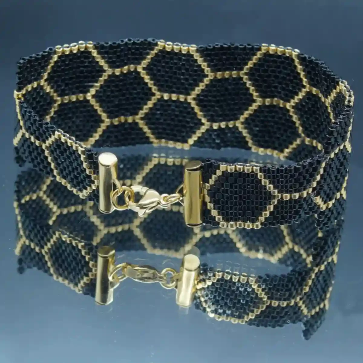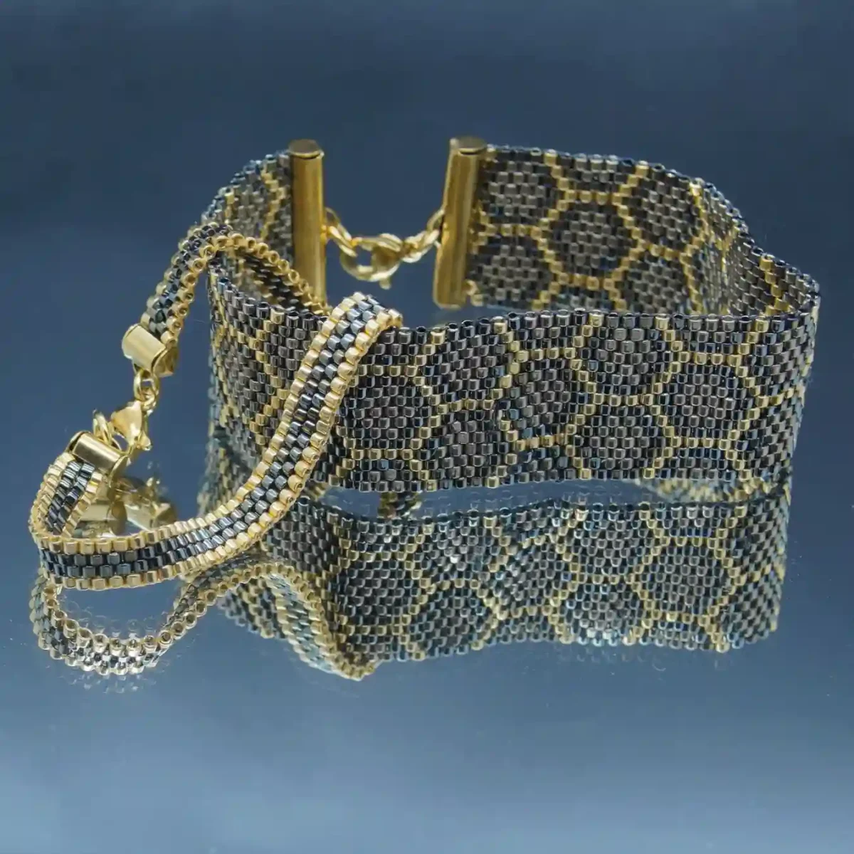 Entièrement réalisée à la main dans mon atelier, elle associe des Miyuki Delica d’une régularité parfaite à des apprêts durables pour traverser le temps avec style.