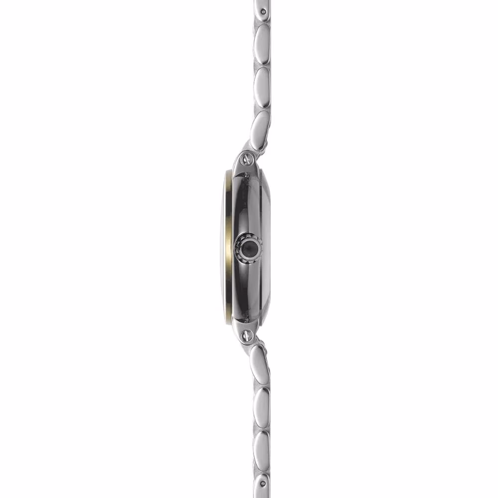 Son bracelet en acier bicolore, avec ses deux rangs centraux dorés et sa boucle déployante, garantit un maintien confortable tout en ajoutant une note de distinction.