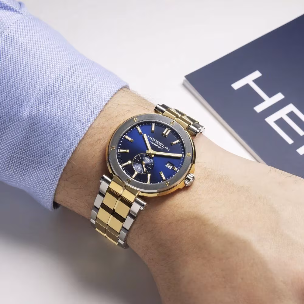 Ce modele pour homme Herbelin Newport 18389BT1N35 mêle élégance sportive et sophistication bicolore dans une pièce emblématique du savoir-faire français. Son boîtier en acier PVD doré jaune de 40,5 mm s’accompagne d’une lunette en acier brossé, mise en valeur par 6 vis dorées, signature incontournable de la collection Newport. Le cadran bleu soleillé, lumineux et profond, présente 2 aiguilles dorées luminescentes, des index dorés, une petite seconde graduée à 6 h ainsi qu’un dateur à 3 h, garantissant une lisibilité parfaite.