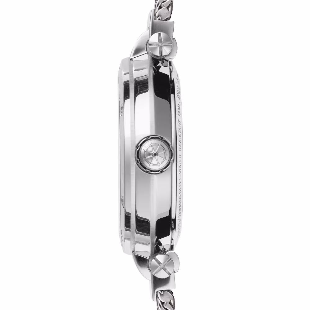Le bracelet en acier maille milanaise, à la fois confortable et sophistiqué, s’ajuste parfaitement au poignet, offrant une touche de modernité et de raffinement.