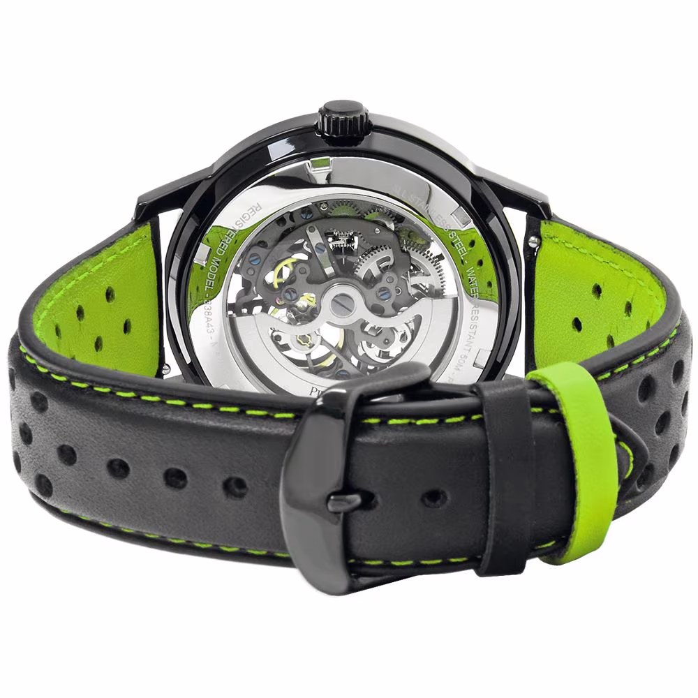 La montre pour homme Pierre Lannier Paddock version aiguilles et étrier vert est un modèle qui allie sportivité et élégance avec un design résolument moderne. Son boîtier en acier noir de 43 mm de diamètre s’associe à un bracelet en cuir noir perforé avec des coutures vertes, offrant un look audacieux et dynamique. Le cadran squelette laisse entrevoir le mécanisme interne, sublimé par des aiguilles vertes et un étrier de frein vert, un clin d’œil à l’univers automobile.