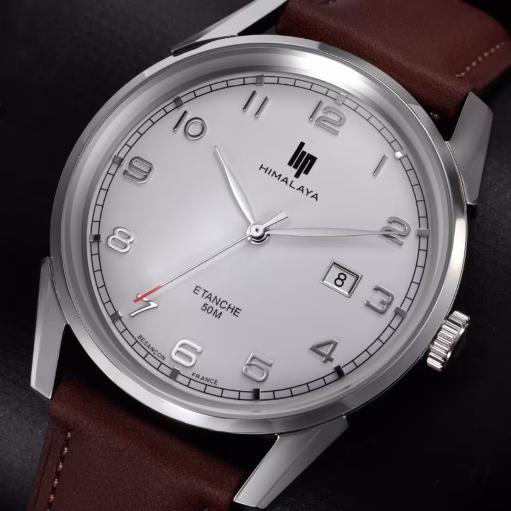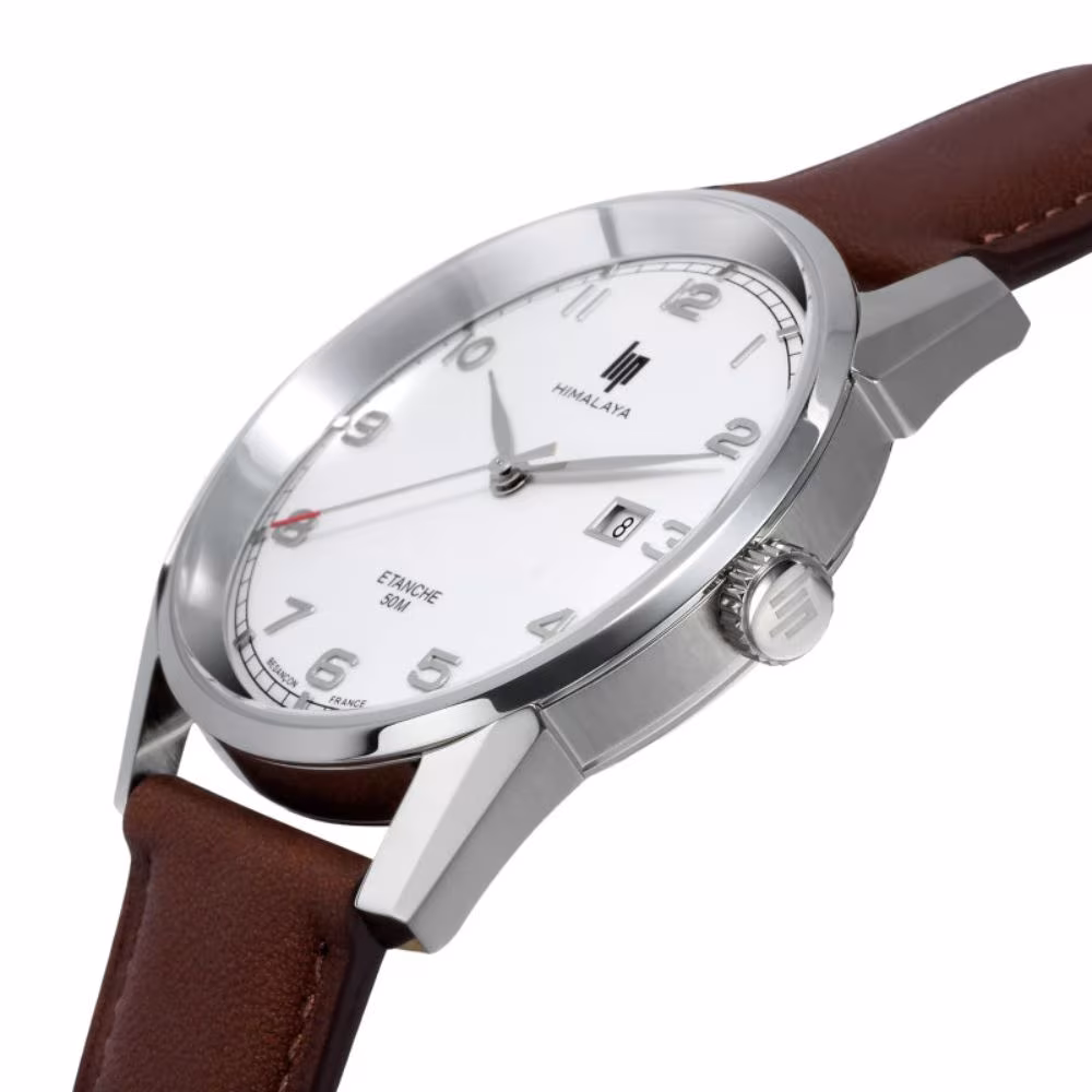 Montre Lip Himalaya 40mm, cadran blanc, cuir marron