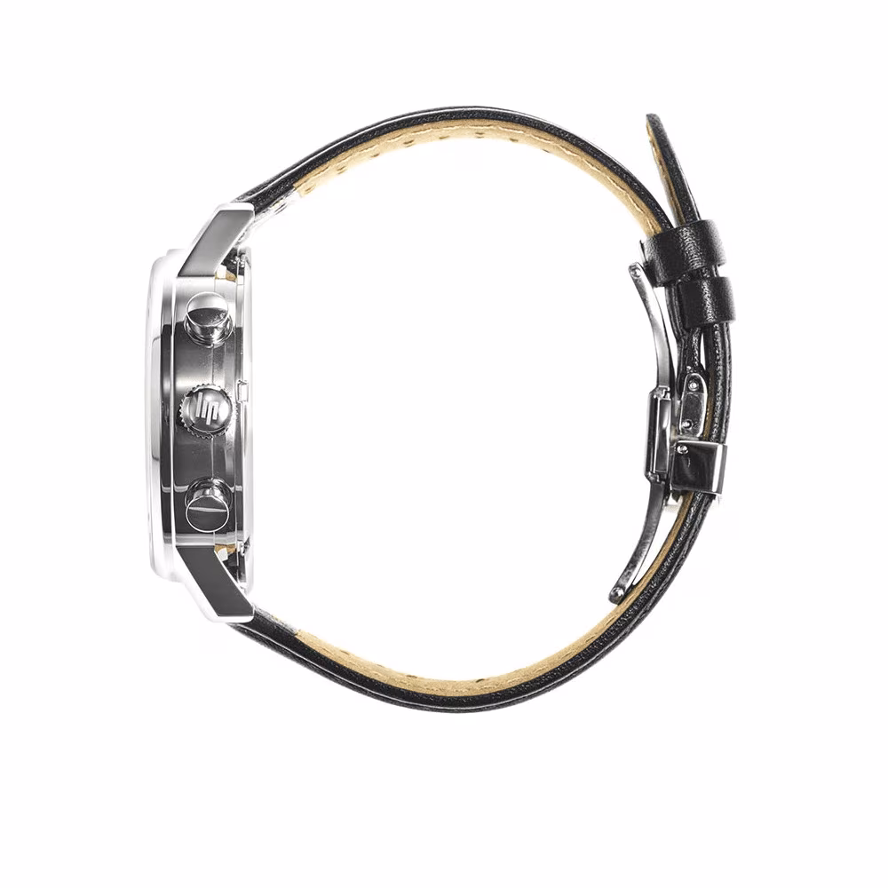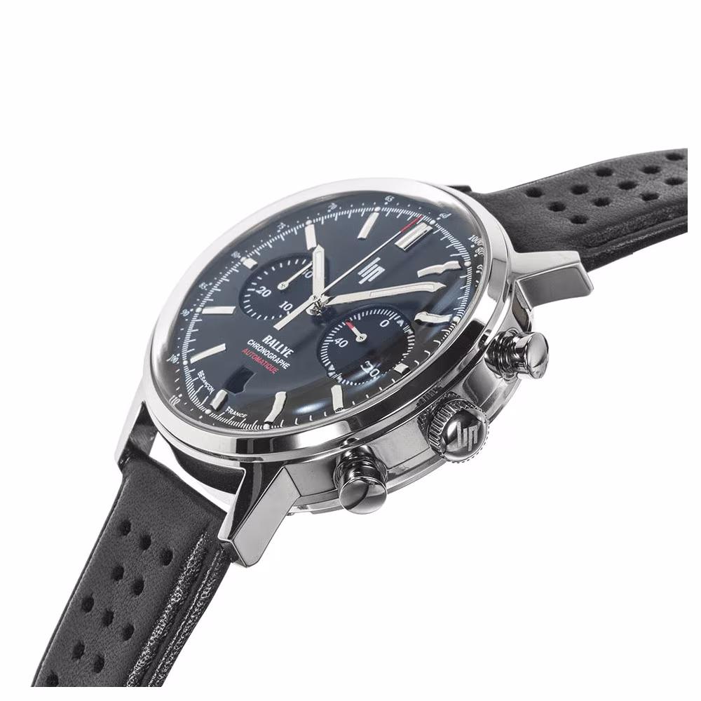 Cette montre Lip Chronographe Automatique porte la référence 671825. Elle est montée sur un bracelet en cuir noir perforé qui rappelle l’esprit des courses automobiles chères à Fred Lip.