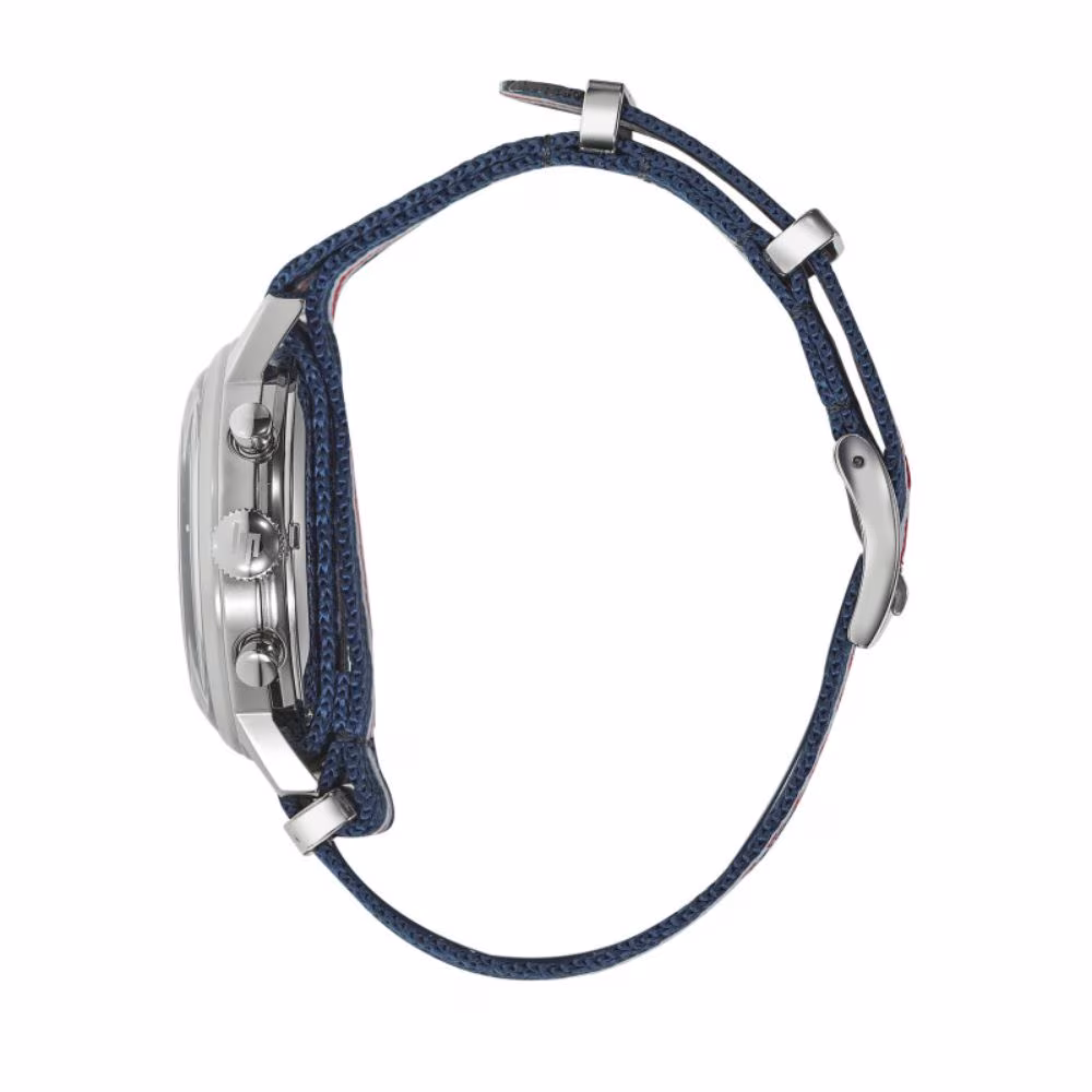Le cadran bicolore blanc et bleu renforce l’identité sportive du modèle. Les aiguilles et index argentés, recouverts de matière luminescente, offrent une lecture claire. Les deux compteurs bleus affichent les minutes du chronographe et l’indication 12/24 h. La trotteuse rouge du chrono apporte un contraste dynamique. Un drapeau à damier s’affiche au centre, clin d’œil immédiat aux courses automobiles. Le verre minéral K1 renforcé et bombé ajoute du relief et protège efficacement le cadran. L’appellation du modèle apparaît en bas du cadran pour signer la pièce.