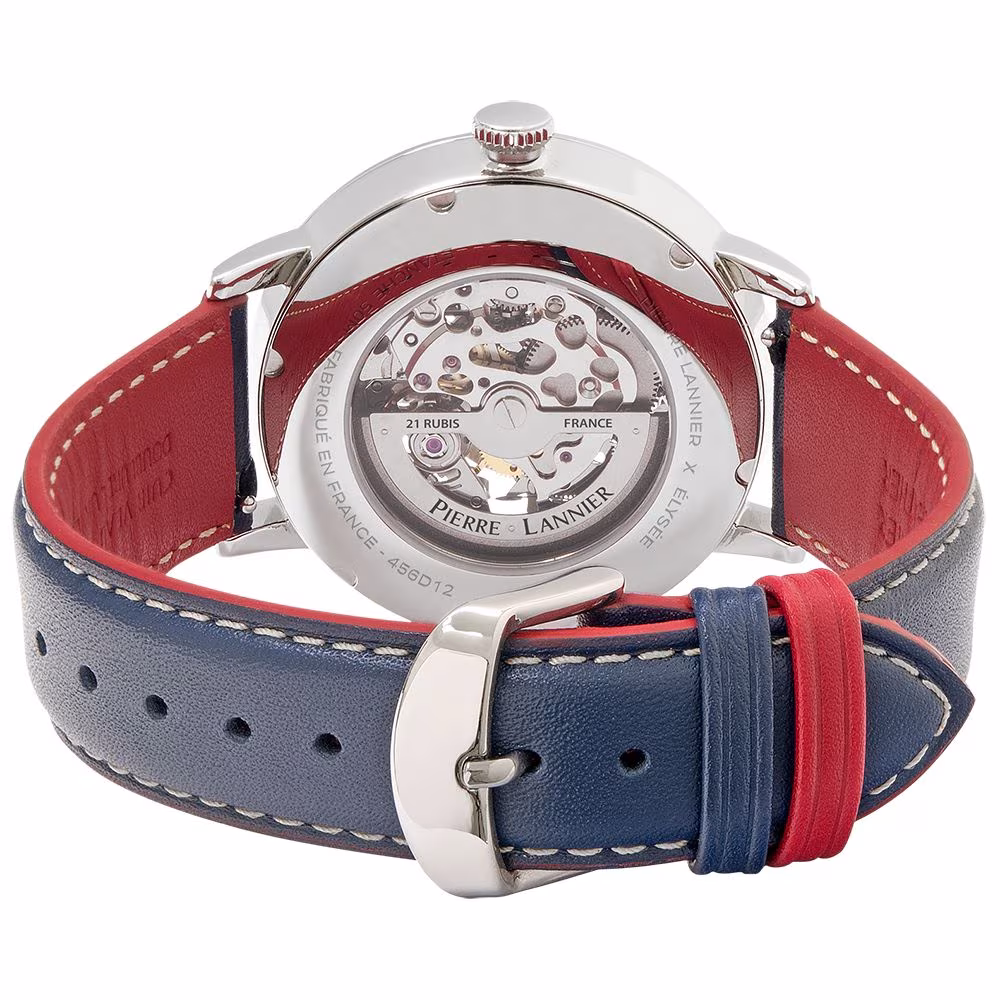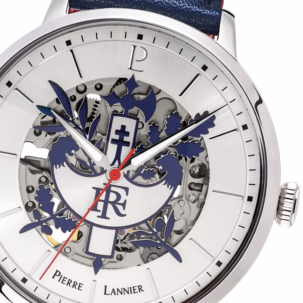 La montre pour homme de la collection Elysée de Pierre Lannier, modèle automatique, est un hommage élégant à la République française. Son cadran squelette offre une vision fascinante du mécanisme intérieur, soulignant l’ingéniosité horlogère. En témoignage de cet hommage, l’armoirie de la France trône avec fierté au centre du cadran, ajoutant une touche emblématique à cette pièce d’exception.