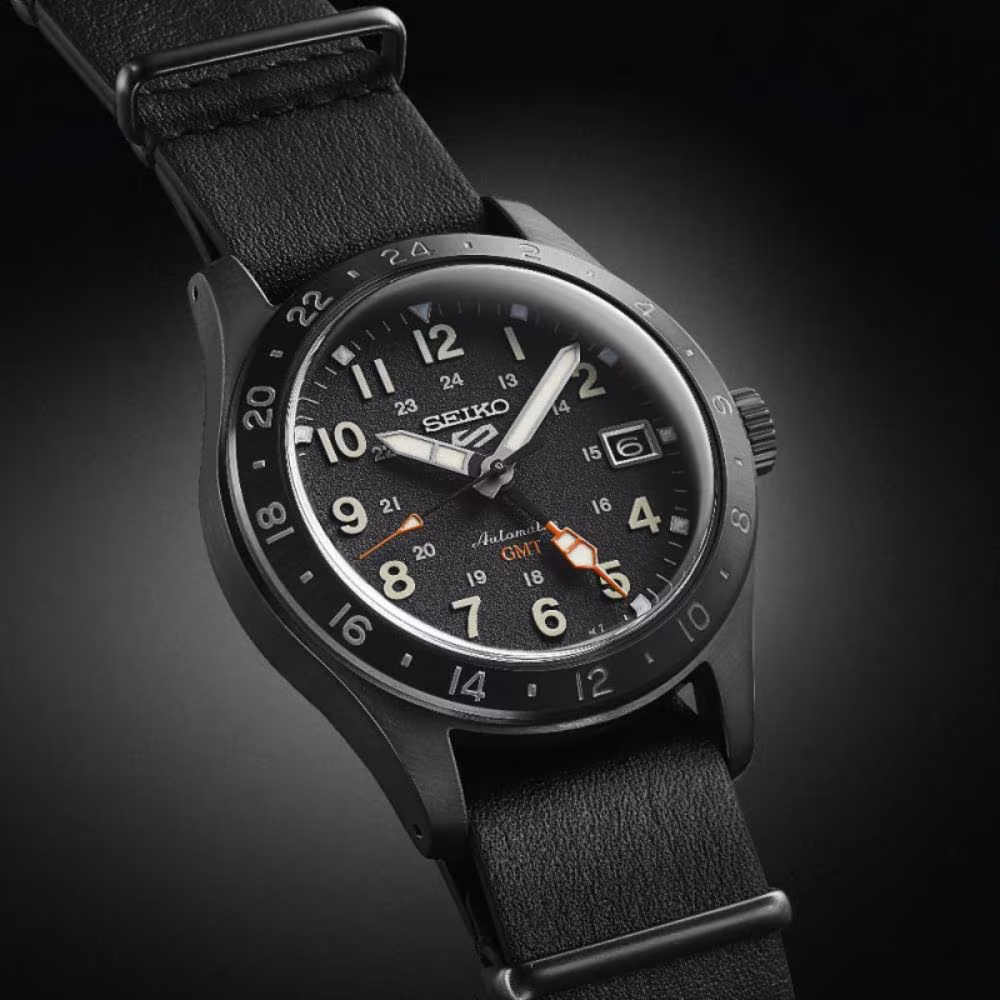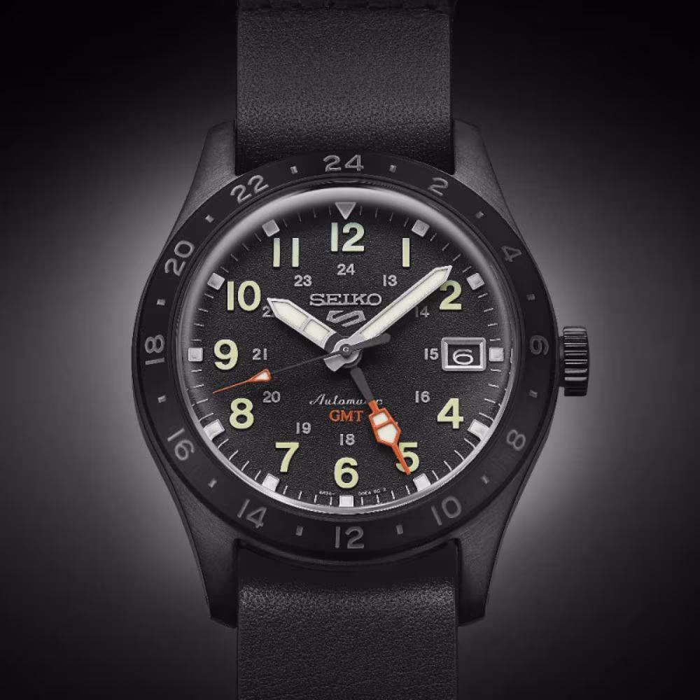 Elle embarque le mouvement automatique Seiko 4R34, offrant une fonction GMT avec un second fuseau horaire indiqué par une aiguille dédiée. Un guichet date est positionné à 3h pour plus de praticité.