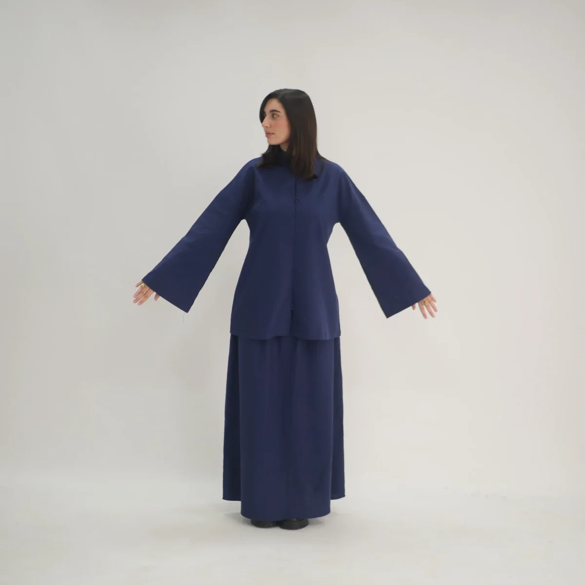 Découvrez notre ensemble deux pièces composé de lin, comprenant une tunique à col bao et une jupe avec poches, ornées de finitions élégantes aux manches et au col pour une touche sophistiquée.