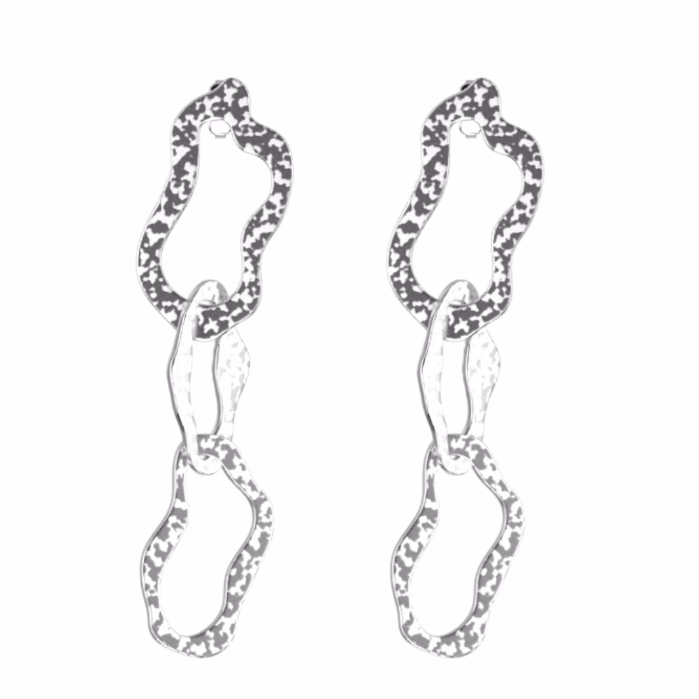 Les boucles d’oreilles pendantes Les Georgettes Écume s’illustrent par un design raffiné et aérien. Elles se composent de trois anneaux aux formes irrégulières, rappelant la vapeur légère de l’écume marine. Chaque élément arbore une trame irrégulière finement gravée recto-verso, offrant un jeu de lumière subtil et élégant à chaque mouvement.