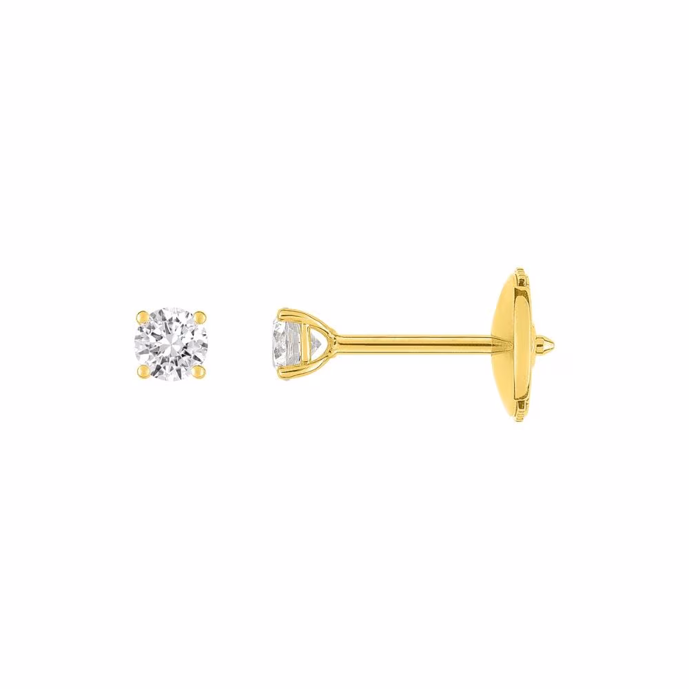 Boucles d’oreilles de type puces en or 750/1000 (18 carats). Serties par 2 diamants de 0.15ct taille brillant de qualité GSI pour un total de 0.30 carats, ces boucles sont un classique pour votre boite a bijoux.