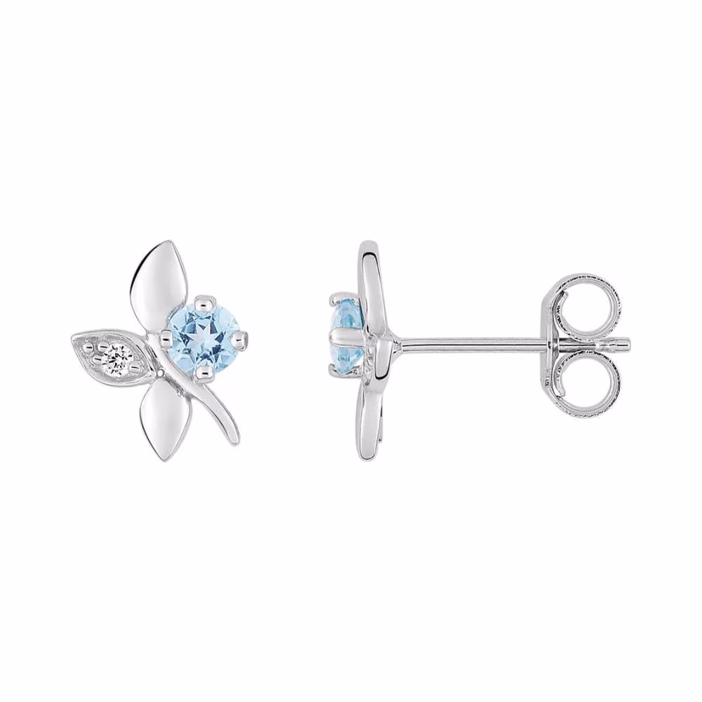 Puces d’oreilles topazes bleu forme fleur et or blanc 375/1000