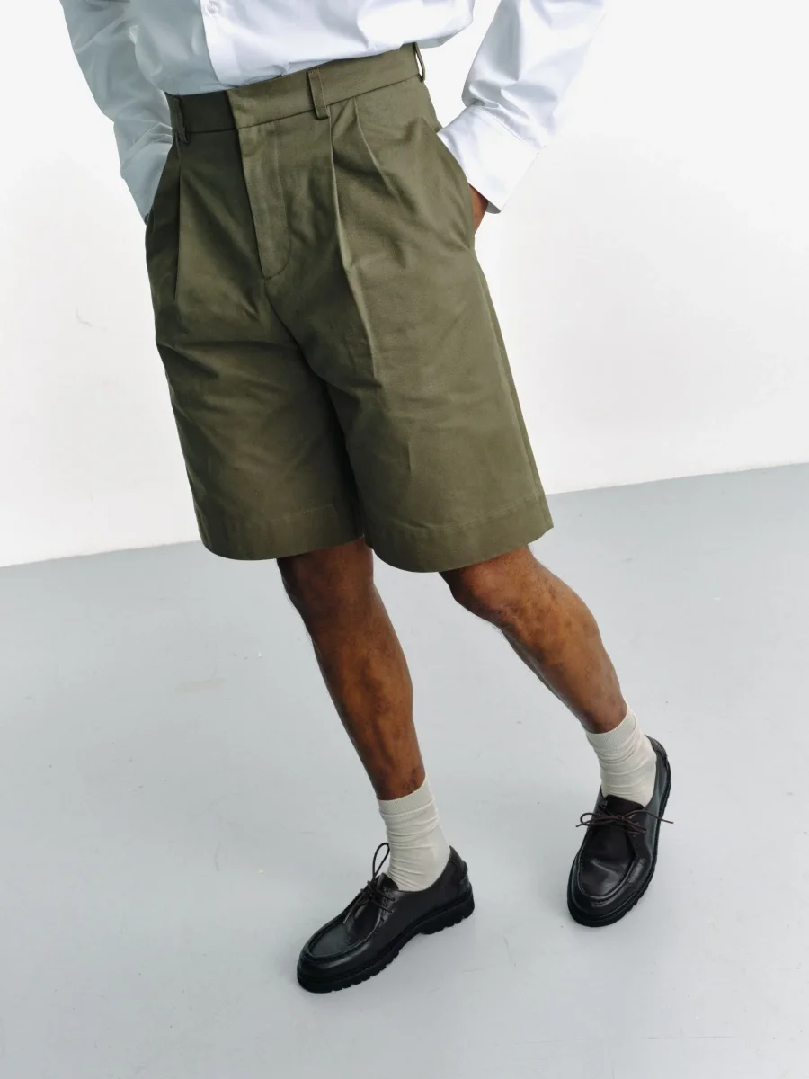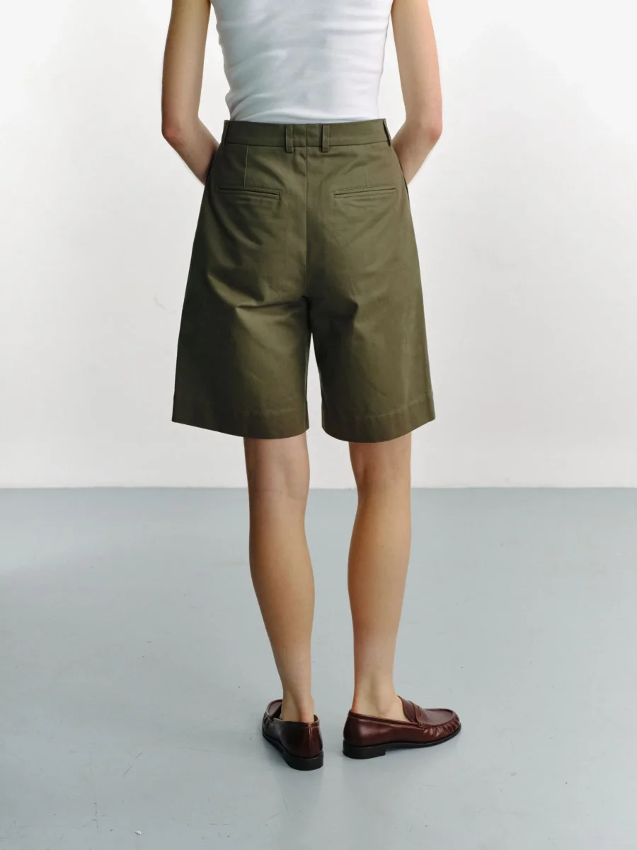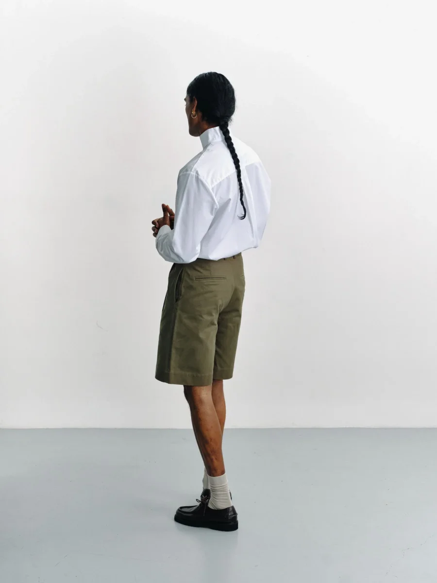 Ce bermuda est coupé dans une gabardine de coton, tissée au Royaume-Uni, à la main douce et au tombé impeccable. Sa coupe classique est soulignée par des plis sur le devant et des poches discrètes prises dans la couture. Deux poches passepoilées sur le dos et un ourlet surpiqué complètent les finitions de cette pièce.