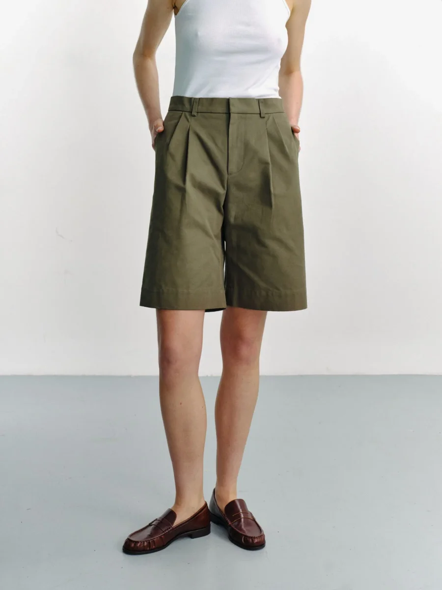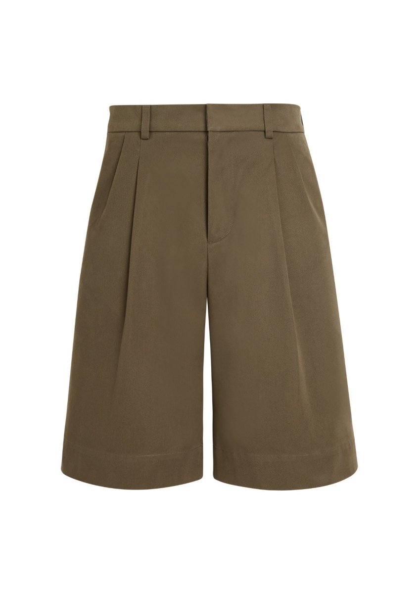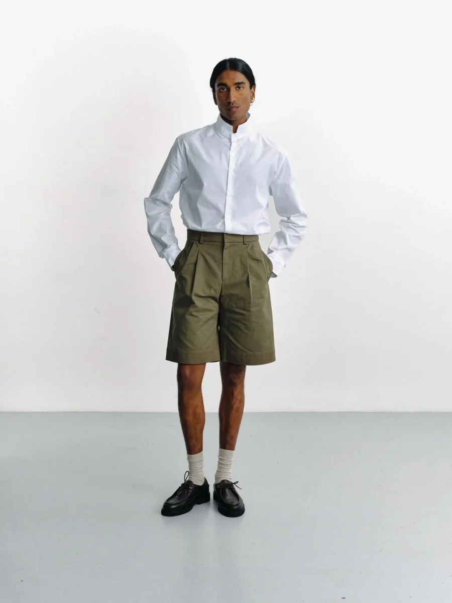 Ce bermuda est coupé dans une gabardine de coton, tissée au Royaume-Uni, à la main douce et au tombé impeccable. Sa coupe classique est soulignée par des plis sur le devant et des poches discrètes prises dans la couture. Deux poches passepoilées sur le dos et un ourlet surpiqué complètent les finitions de cette pièce.